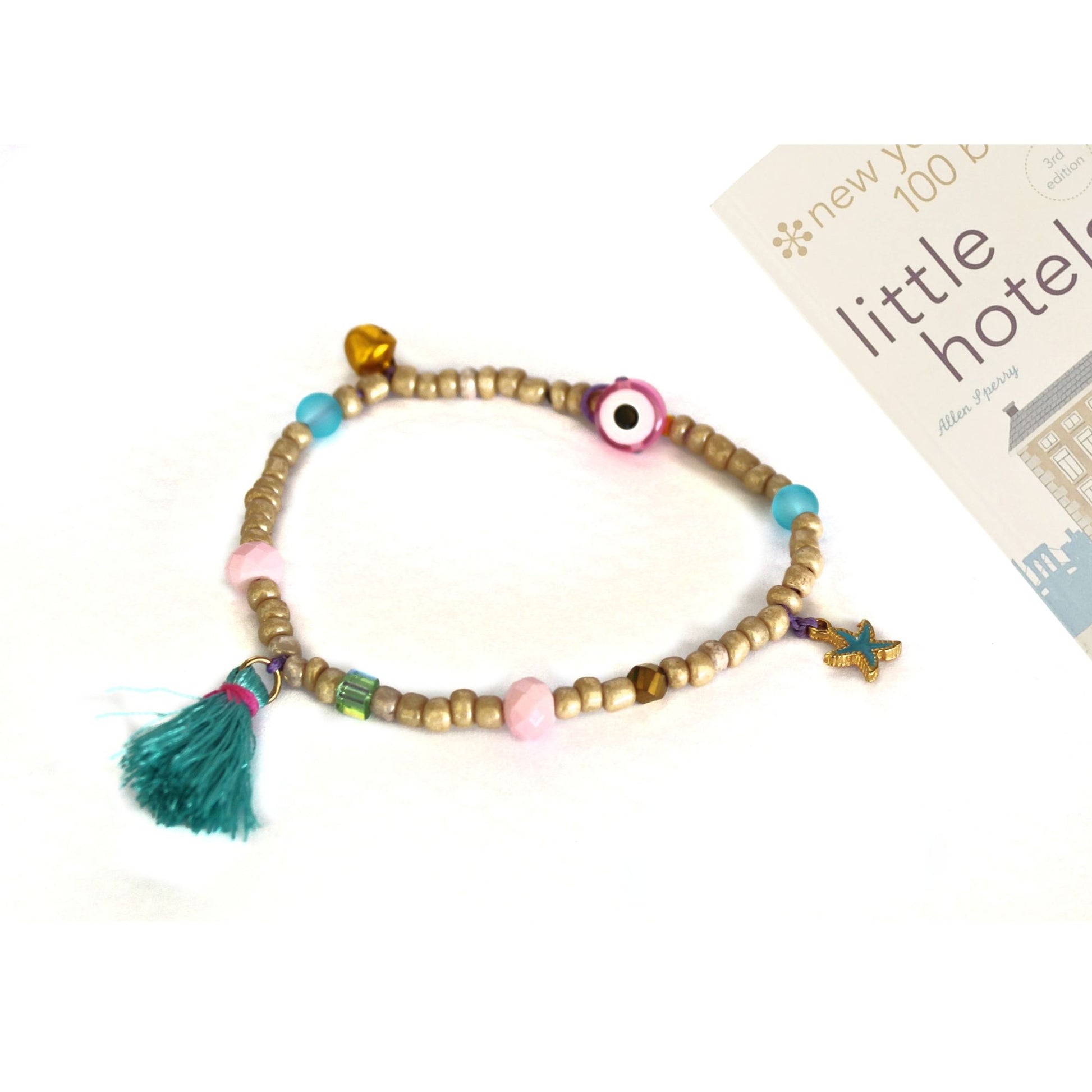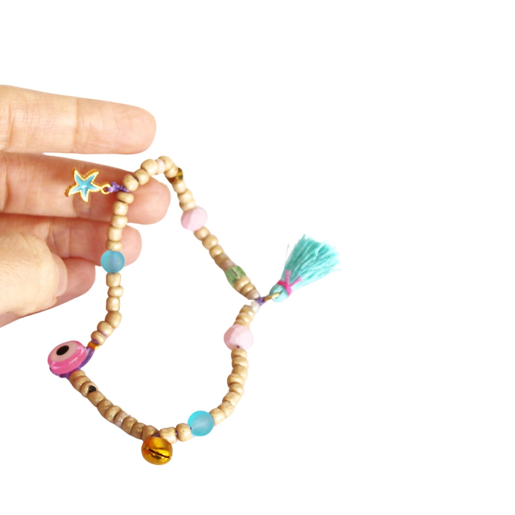 Αυτό το χαρούμενο βραχιόλι ποδιού είναι φτιαγμένο με πολύχρωμες χάντρες, ένα μεταλλικό στοιχείο (charm) και μια παιχνιδιάρικη φουντίτσα, δεμένα πάνω σε μαλακό κορδόνι για άνετη εφαρμογή. Επιλογή ανάμεσα σε διάφορα χρώματα με διάφορες χάντρες και μεταλλικά στοιχεία. Καθώς υπάρχει η επιλογή ανάμεσα σε νούμερο ενηλίκου ή παιδικό, είναι ιδανικό για παιδιά, ενήλικες ή ακόμα και ως σετ για "μαμά και κόρη", φέρνοντας μια νότα παιχνιδιάρικης κομψότητας σε κάθε εμφάνιση.