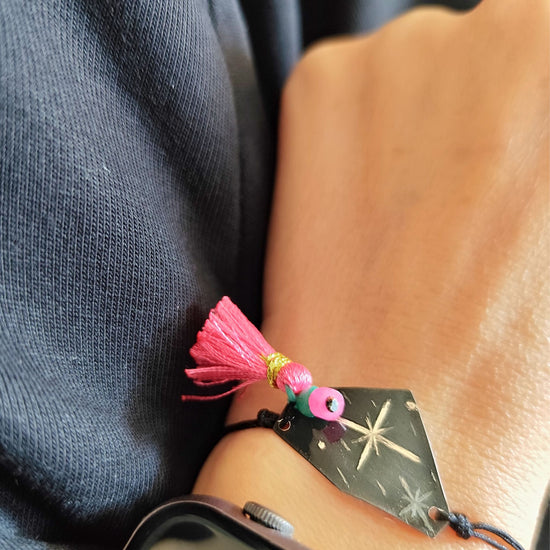 Είναι εξ' ολοκλήρου φτιαγμένο στο χέρι. Το βραχιόλι ανοιγοκλείνει εύκολα με κόμπους (sliding knots).