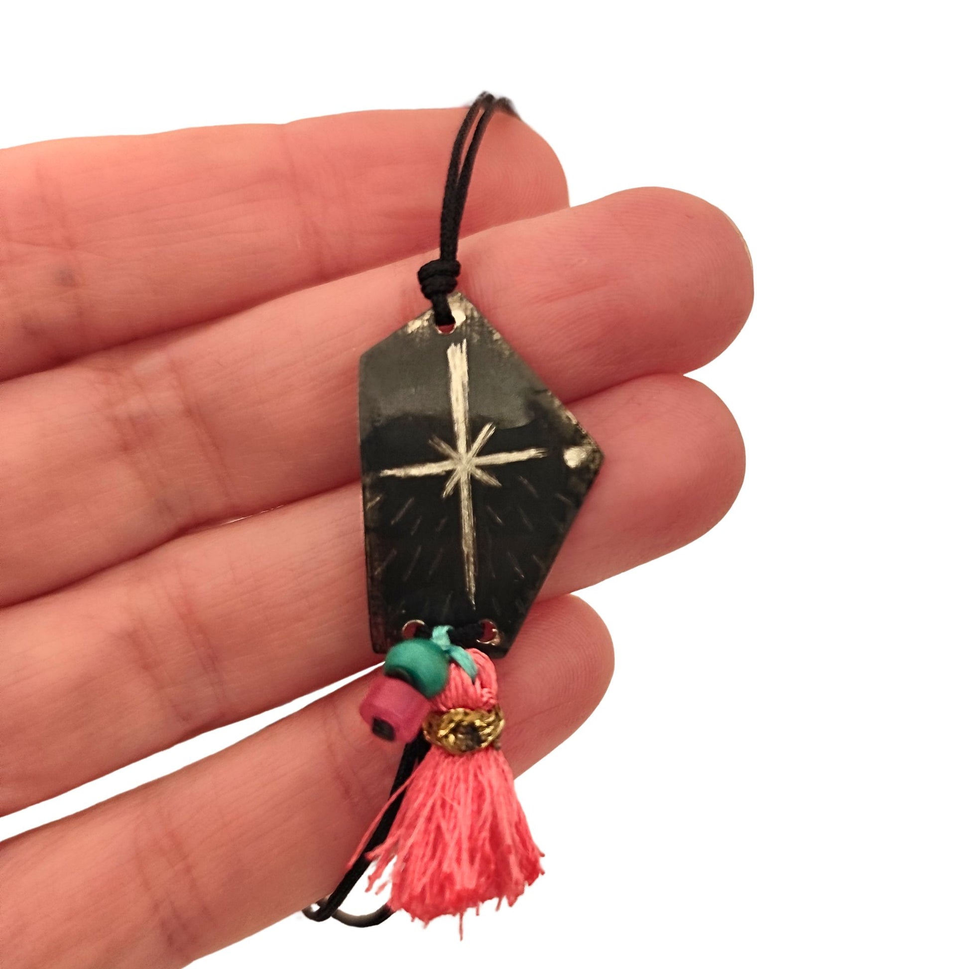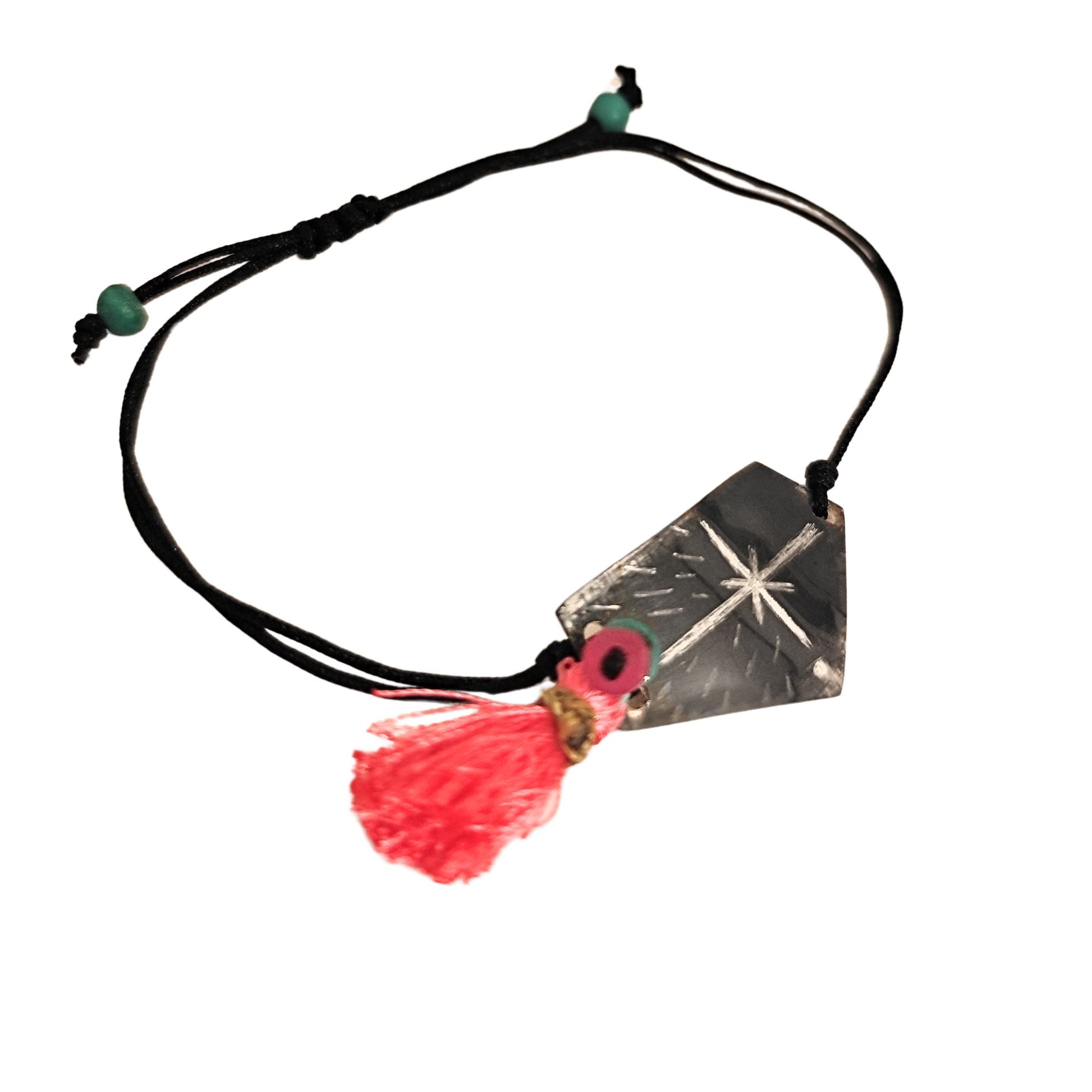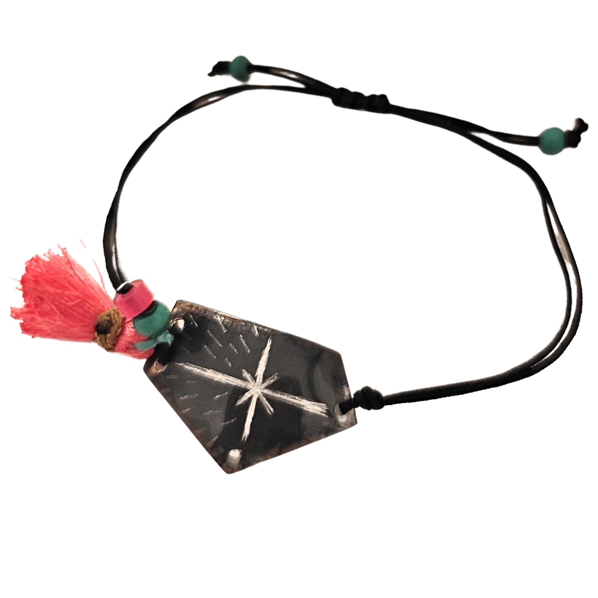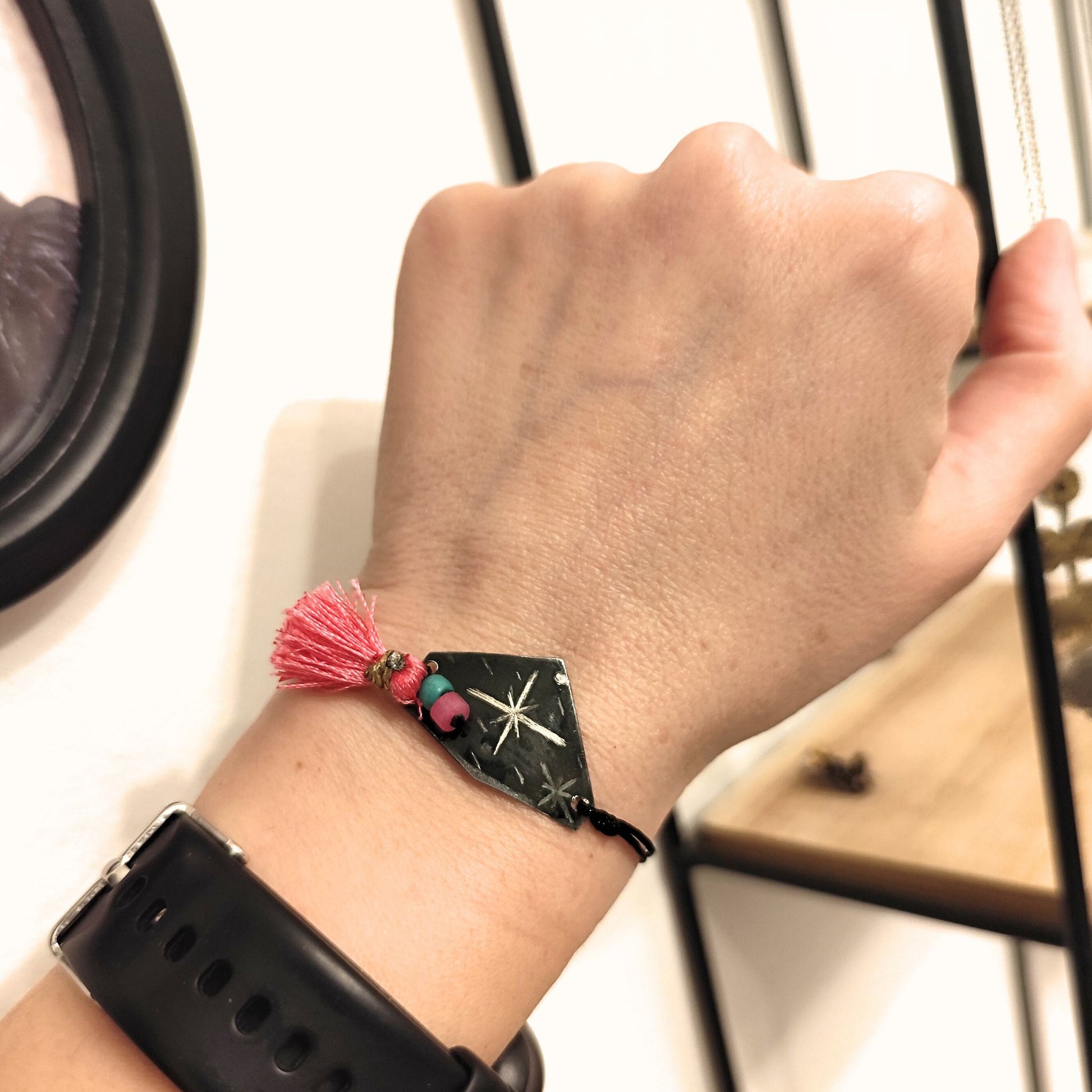 Χειροποίητο ασημένιο στοιχείο οξειδωμένο με χαραγμένο ένα αστραφτερό ασημένιο αστέρι να ξεχωρίζει πάνω σε ένα βαθύ, οξειδωμένο φόντο. Κάθε βραχιόλι είναι μοναδικό, όπως και τα αστέρια στον ουρανό. Ένα κόσμημα για όσους αγαπούν τη μαγεία της νύχτας και το σύμπαν.