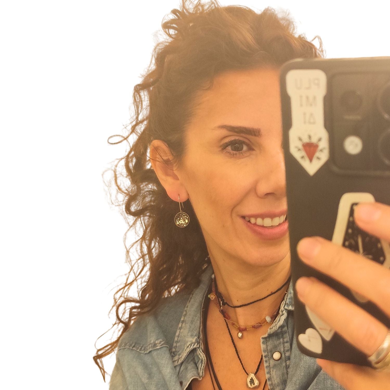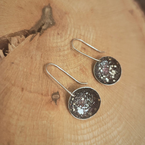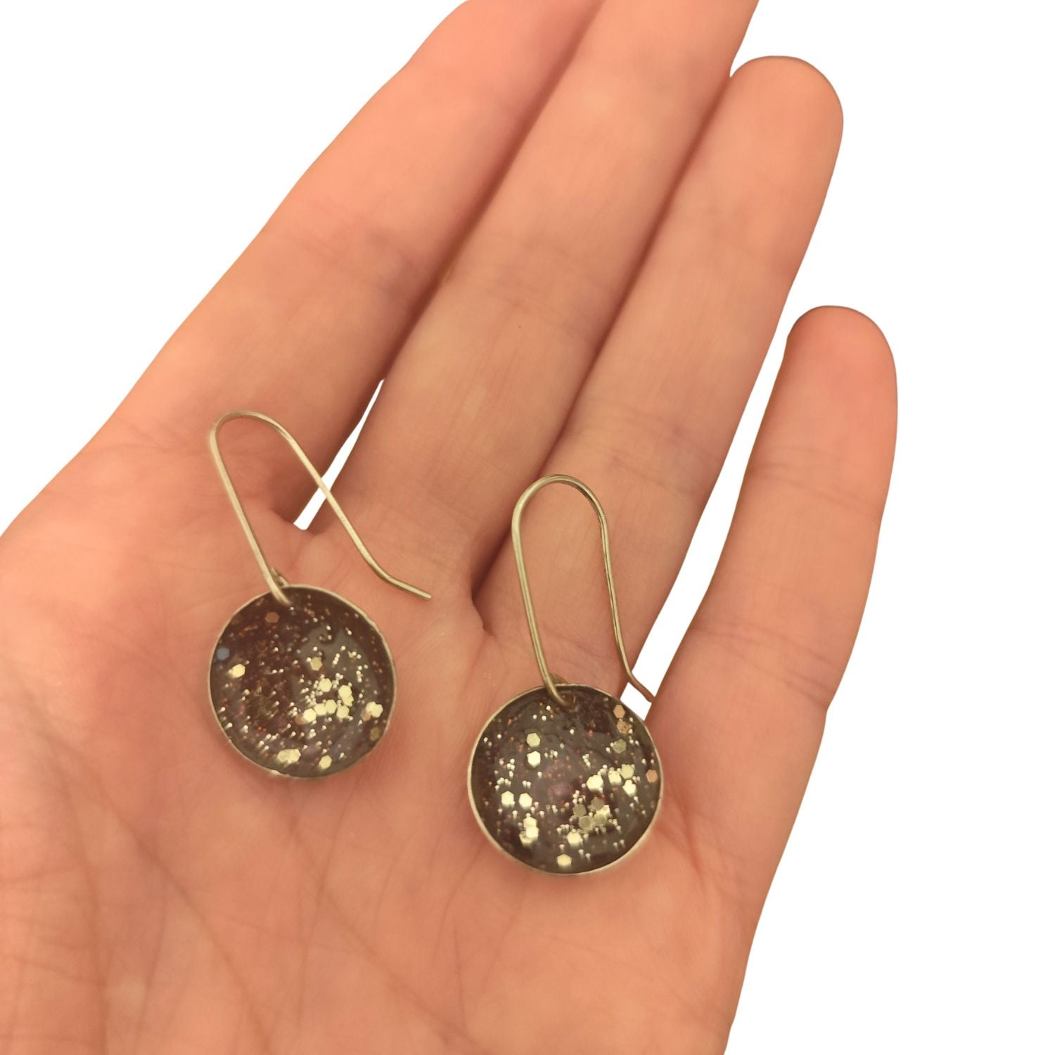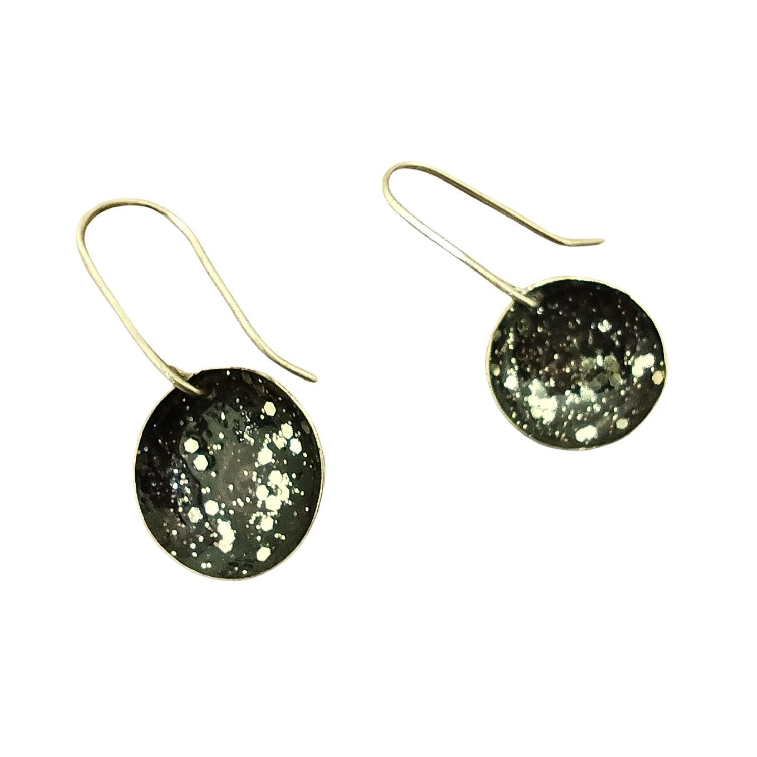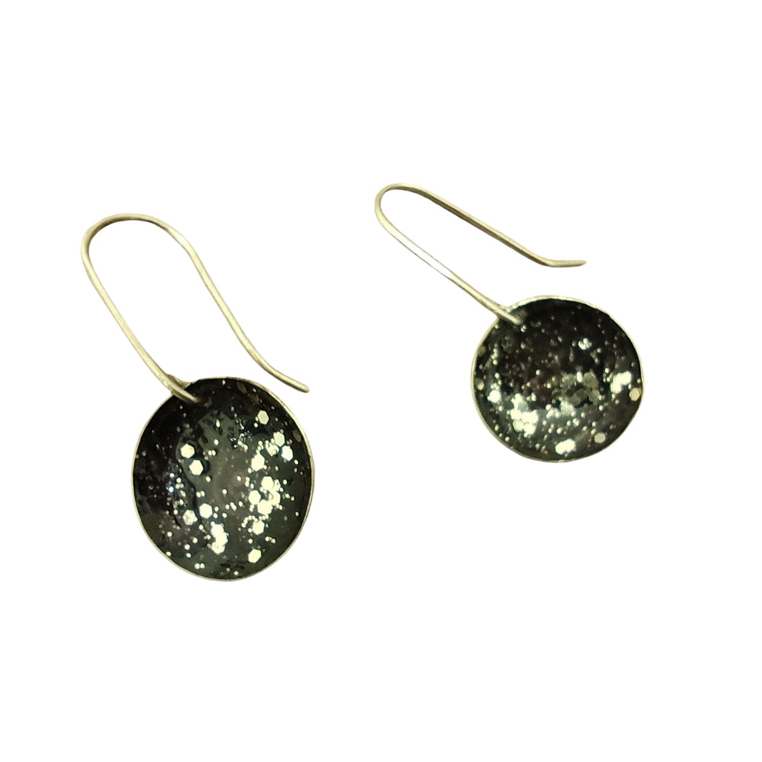 Χειροποίητα ασημένια σκουλαρίκια εμπνευσμένα από τον νυχτερινό ουρανό. Οξειδωμένος ασημένιος δίσκος που λαμπυρίζει με φωτεινές πινελιές γκλίτερ, σαν αστρική σκόνη απλωμένη στο σύμπαν. Ένα μοντέρνο αλλά ποιητικό κόσμημα που χαρίζει ουράνια γοητεία σε κάθε εμφάνιση.