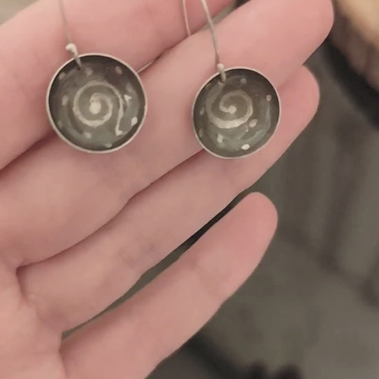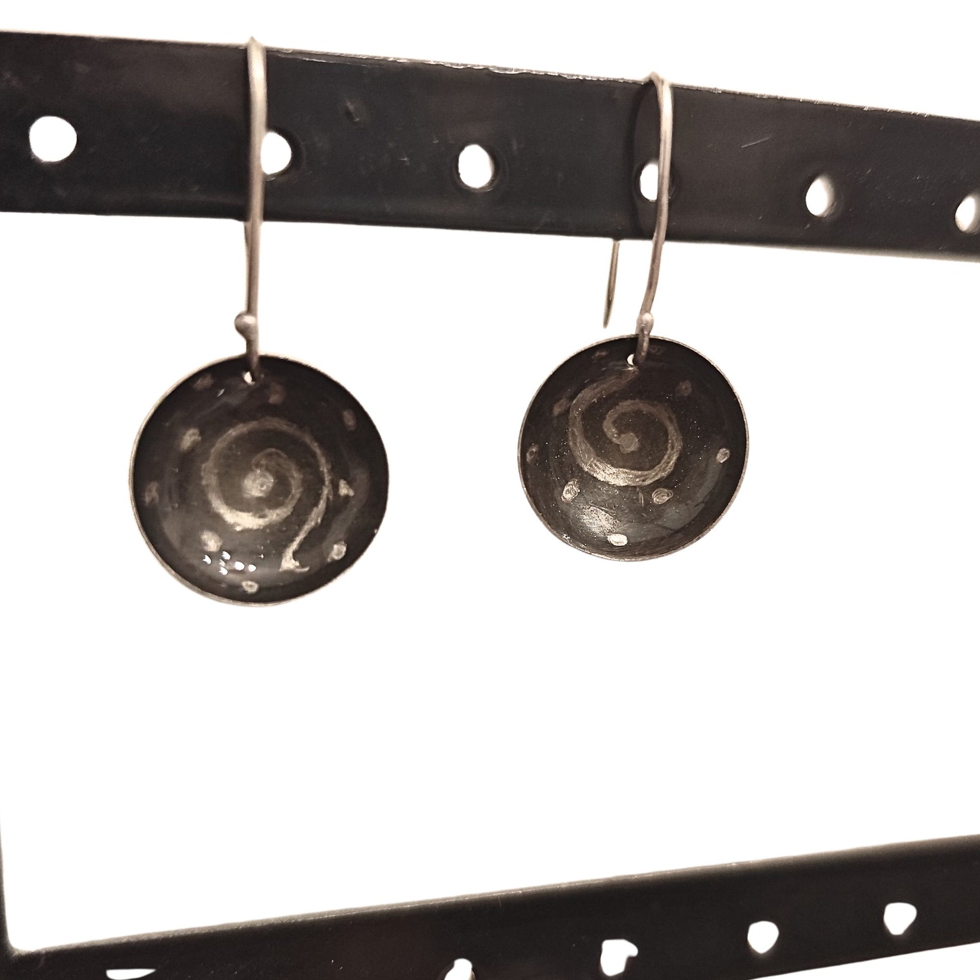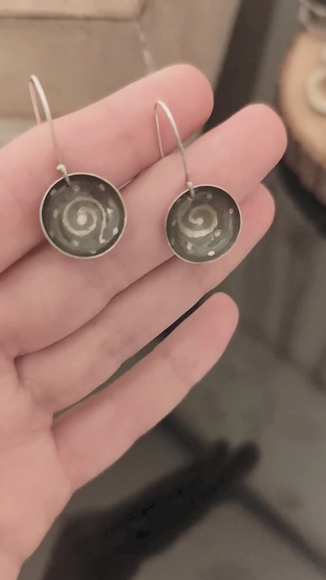 Πρόσθεσε μια κοσμική πινελιά στο καθημερινό σου στυλ. Φτιαγμένα στο χέρι από οξειδωμένο ασήμι και χαραγμένες σπείρες εμπνευσμένες από το διάστημα, είναι ελαφριά και εντυπωσιακά. Ιδανικά για όσους αγαπούν τον μινιμαλισμό.