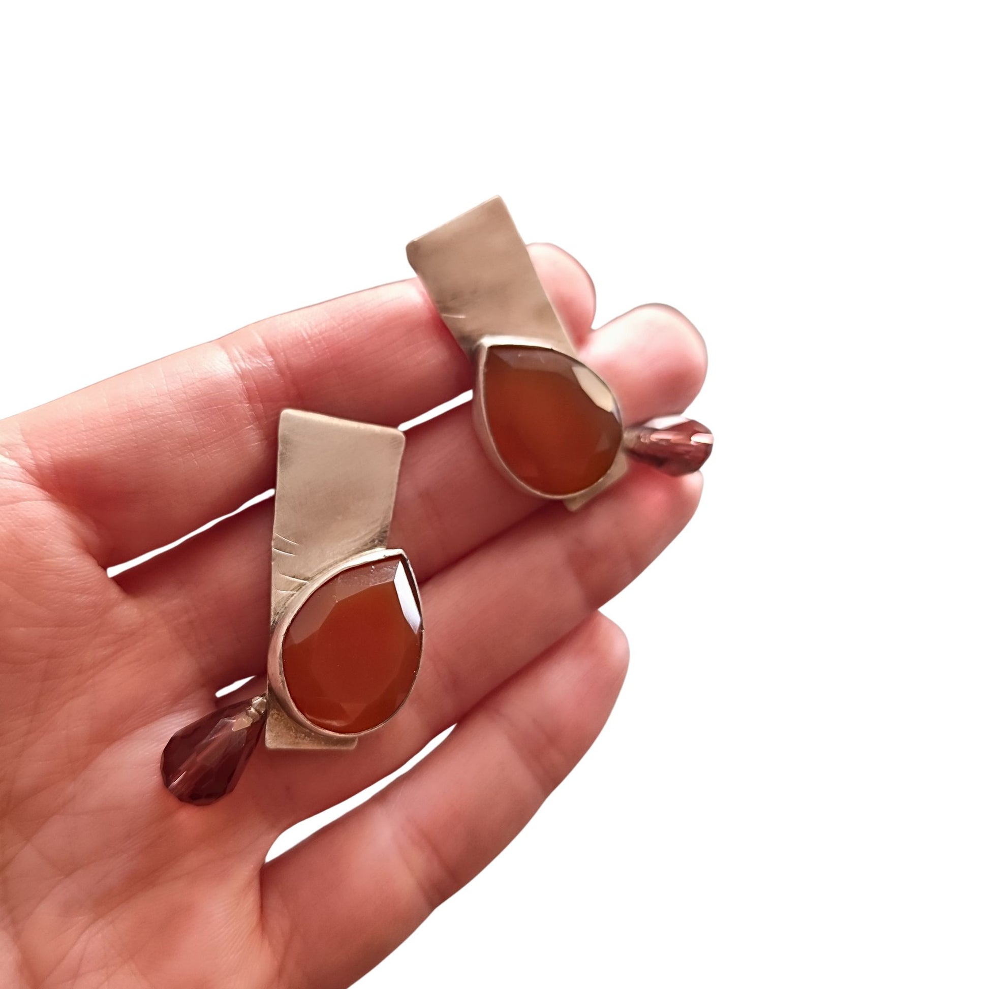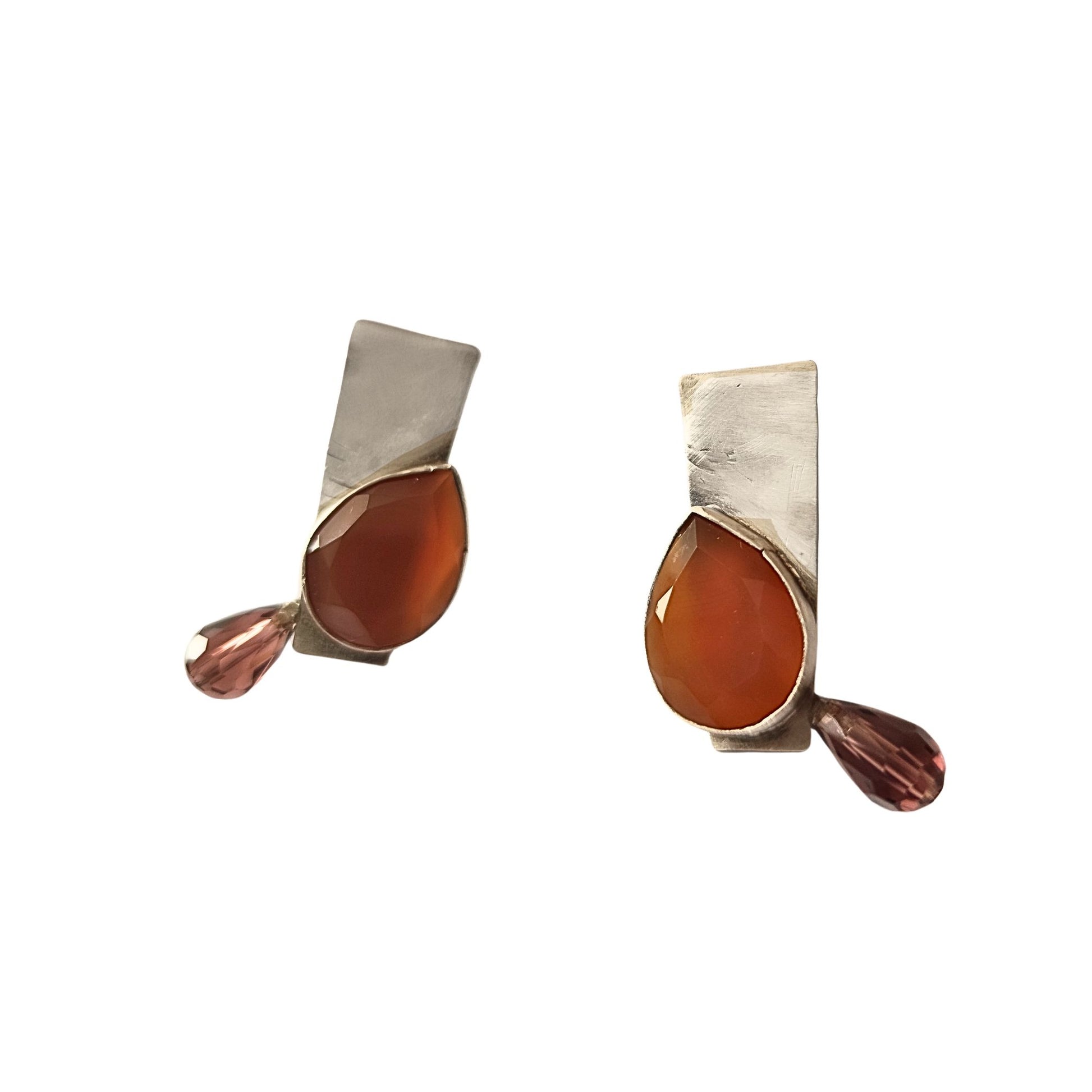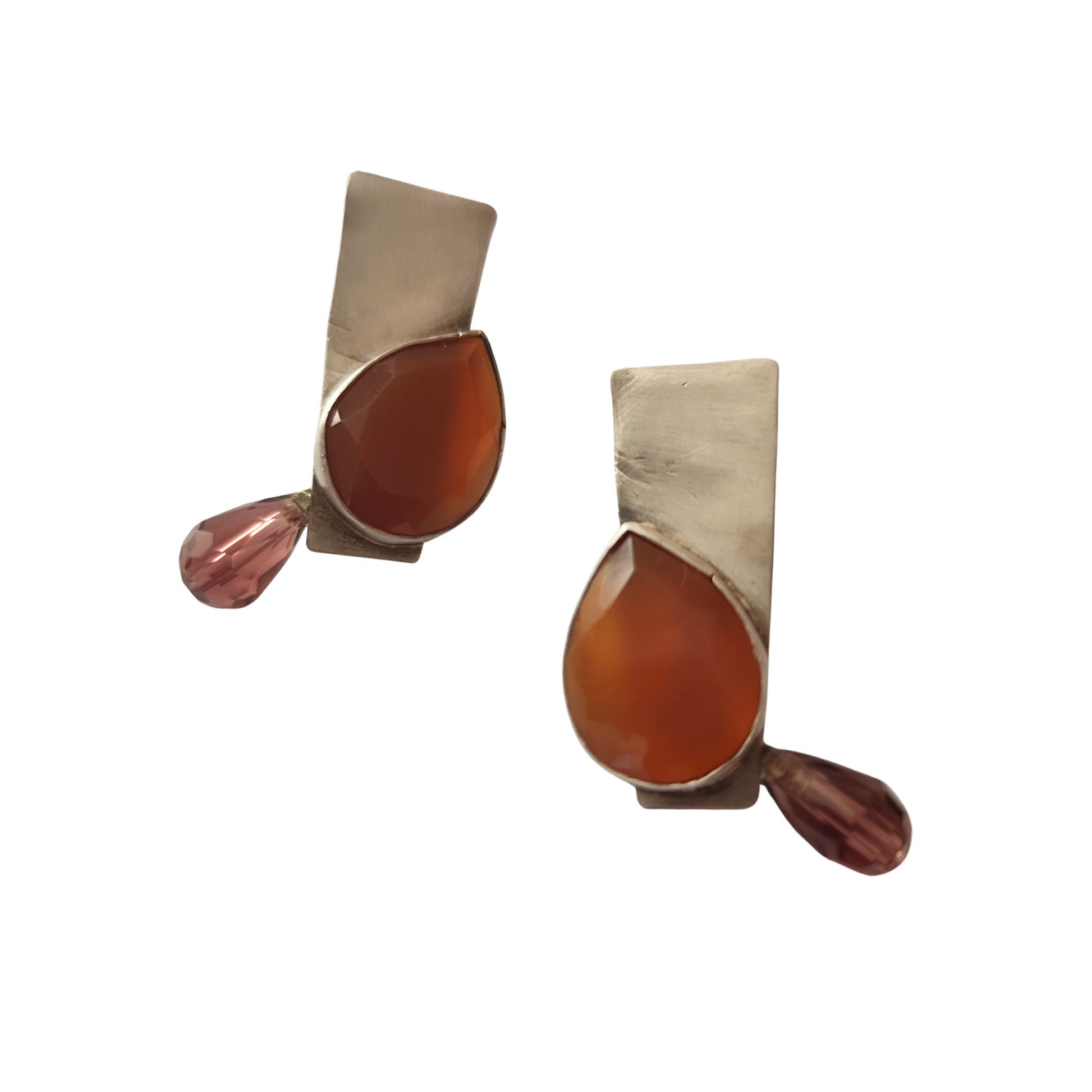Ασύμμετρα και γεμάτα χαρακτήρα, αυτά τα σκουλαρίκια συνδυάζουν ζωηρές πέτρες καρνεόλης με λεπτεπίλεπτους μωβ κρυστάλλους. Οι ζεστοί πορτοκαλί τόνοι συναντούν το απαλό μωβ σε ένα παιχνιδιάρικο αλλά κομψό σχέδιο που αποπνέει χαρά και μοναδικότητα. Εντυπωσιακά — ιδανικά για τολμηρές ψυχές.