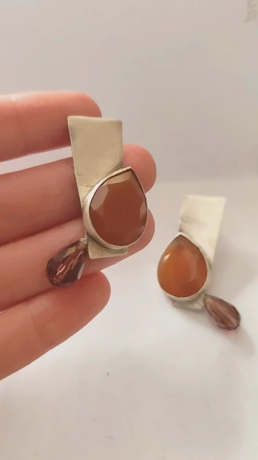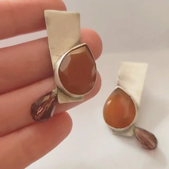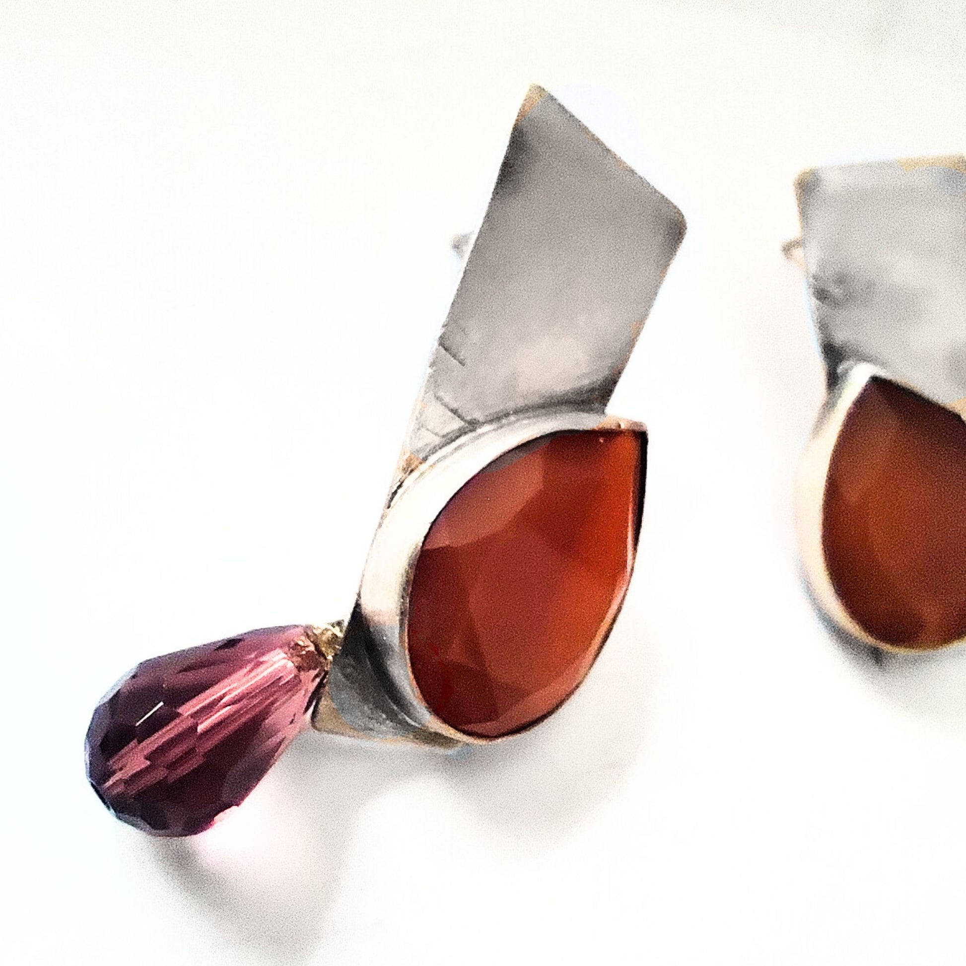 Ασύμμετρα και γεμάτα χαρακτήρα, αυτά τα σκουλαρίκια συνδυάζουν ζωηρές πέτρες καρνεόλης με λεπτεπίλεπτους μωβ κρυστάλλους. Οι ζεστοί πορτοκαλί τόνοι συναντούν το απαλό μωβ σε ένα παιχνιδιάρικο αλλά κομψό σχέδιο που αποπνέει χαρά και μοναδικότητα. Εντυπωσιακά — ιδανικά για τολμηρές ψυχές.