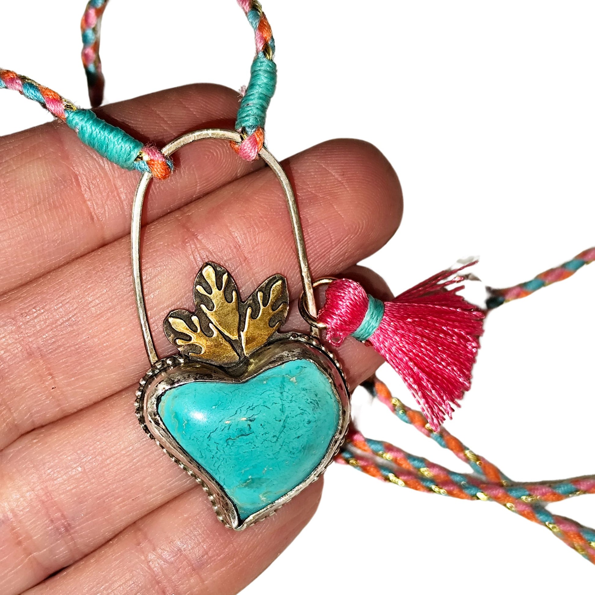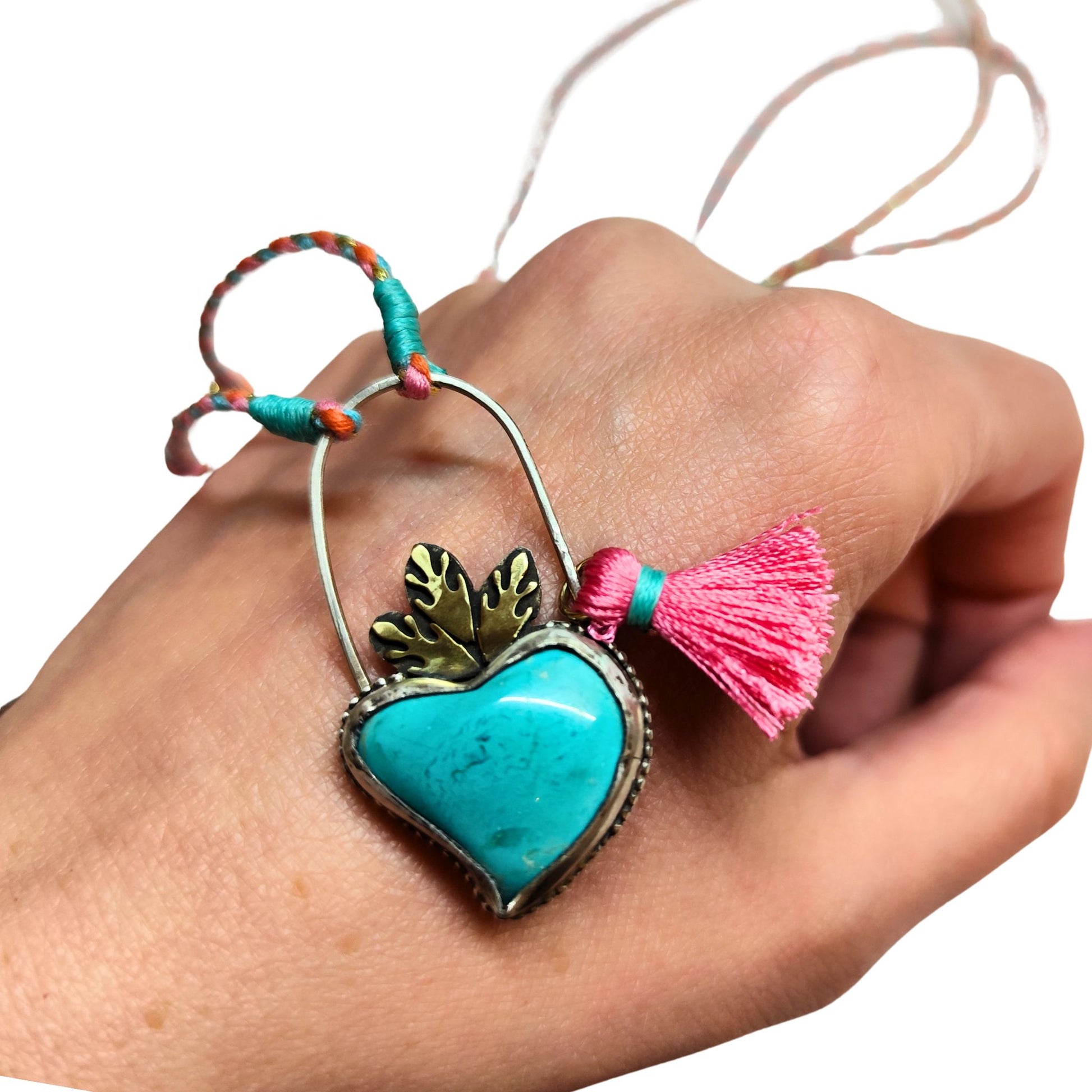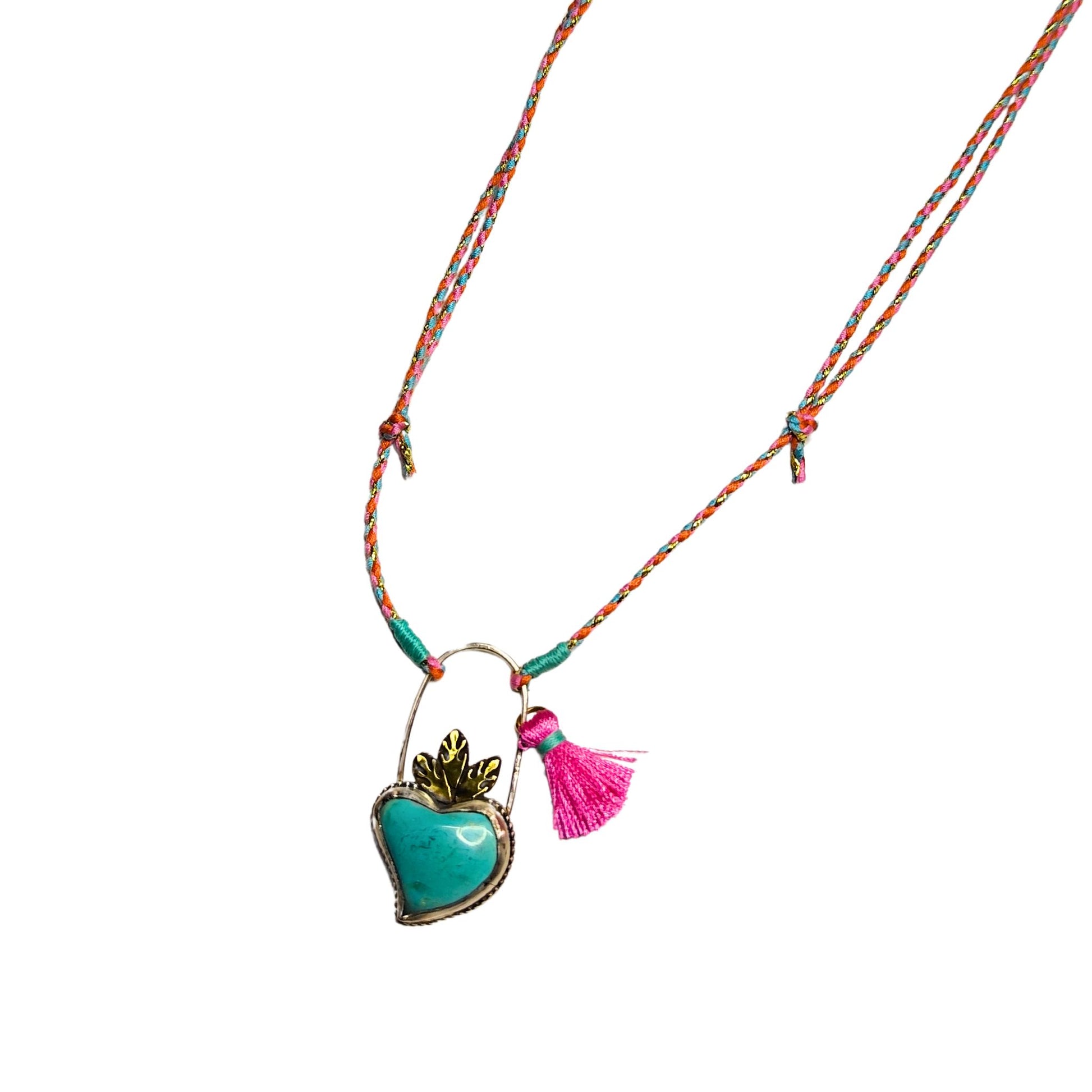 Ένα παιχνιδιάρικο και ανέμελο μενταγιόν σε σχήμα καρδιάς, με μια τιρκουάζ πέτρα στο κέντρο και ροζ φουντίτσα που προσθέτει γοητεία. Εμπνευσμένο από το boho στυλ, δίνει χρώμα, υφή και νόημα σε κάθε σου εμφάνιση. Ιδανικό για να φορεθεί μόνο του ή σε layering με άλλα κολιέ, καθώς το μήκος του αυξομειώνεται.