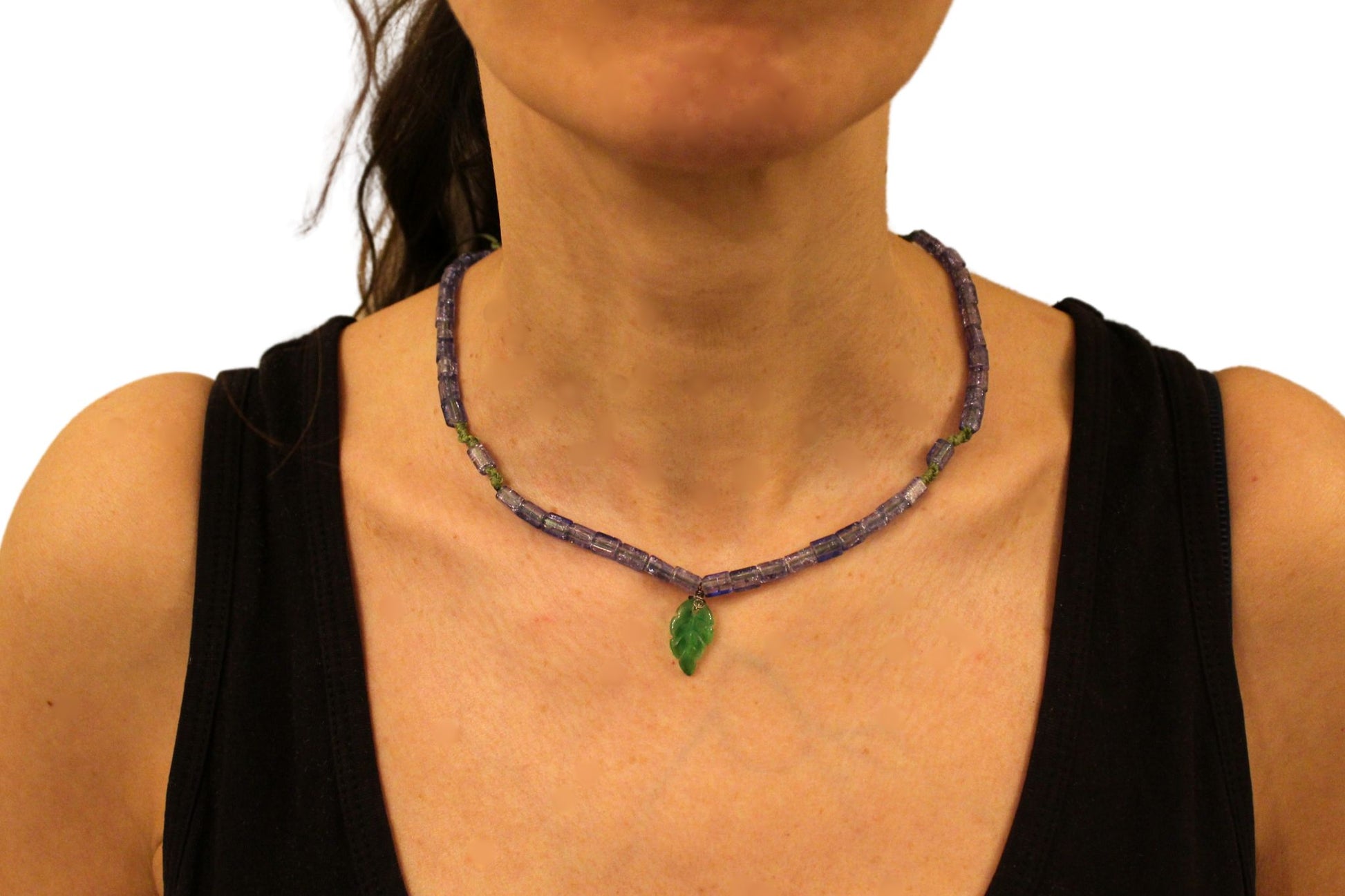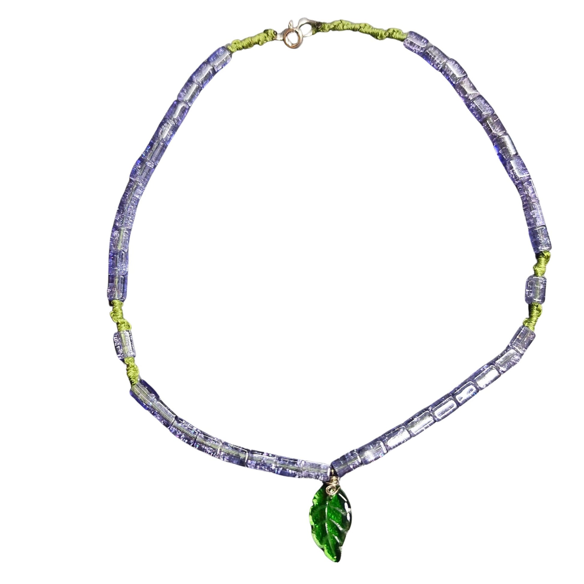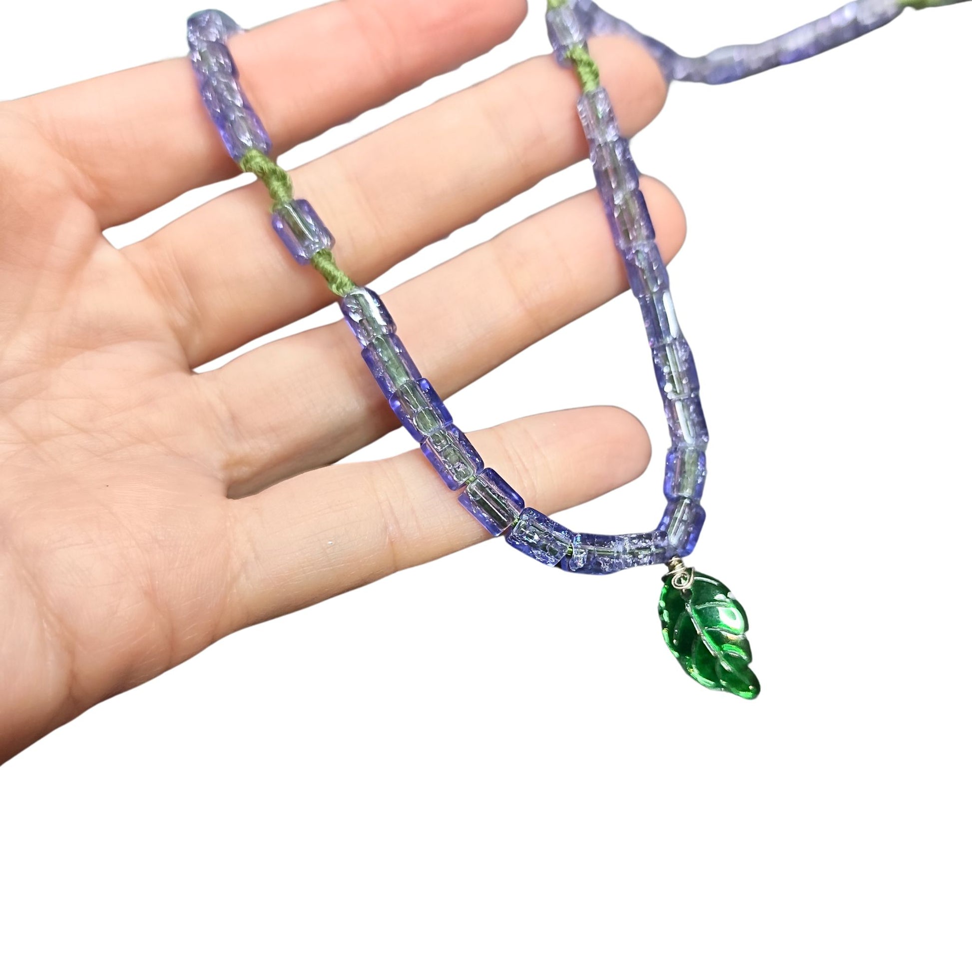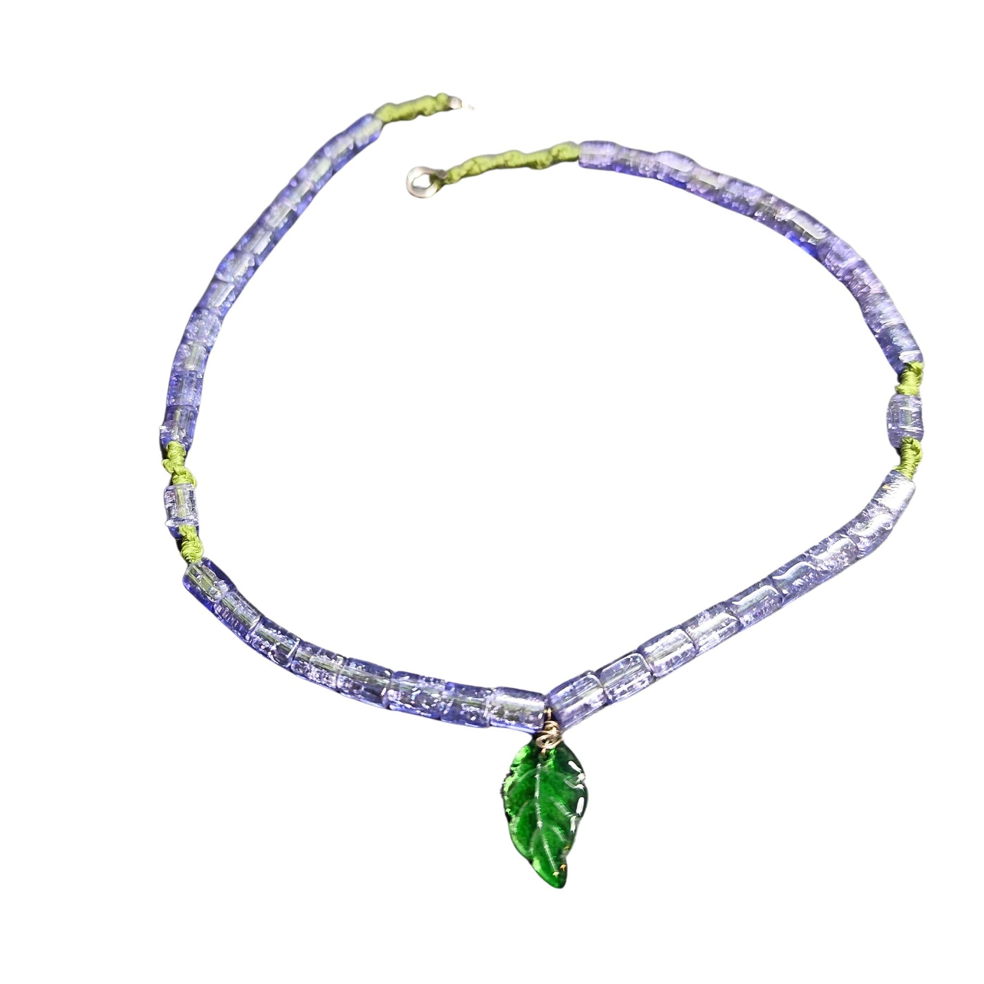 Το κολιέ Δάφνη συνδυάζει μωβ γυάλινες χάντρες με ένα φύλλο στο κέντρο — σαν ένα καλοκαιρινό αεράκι σε κόσμημα.