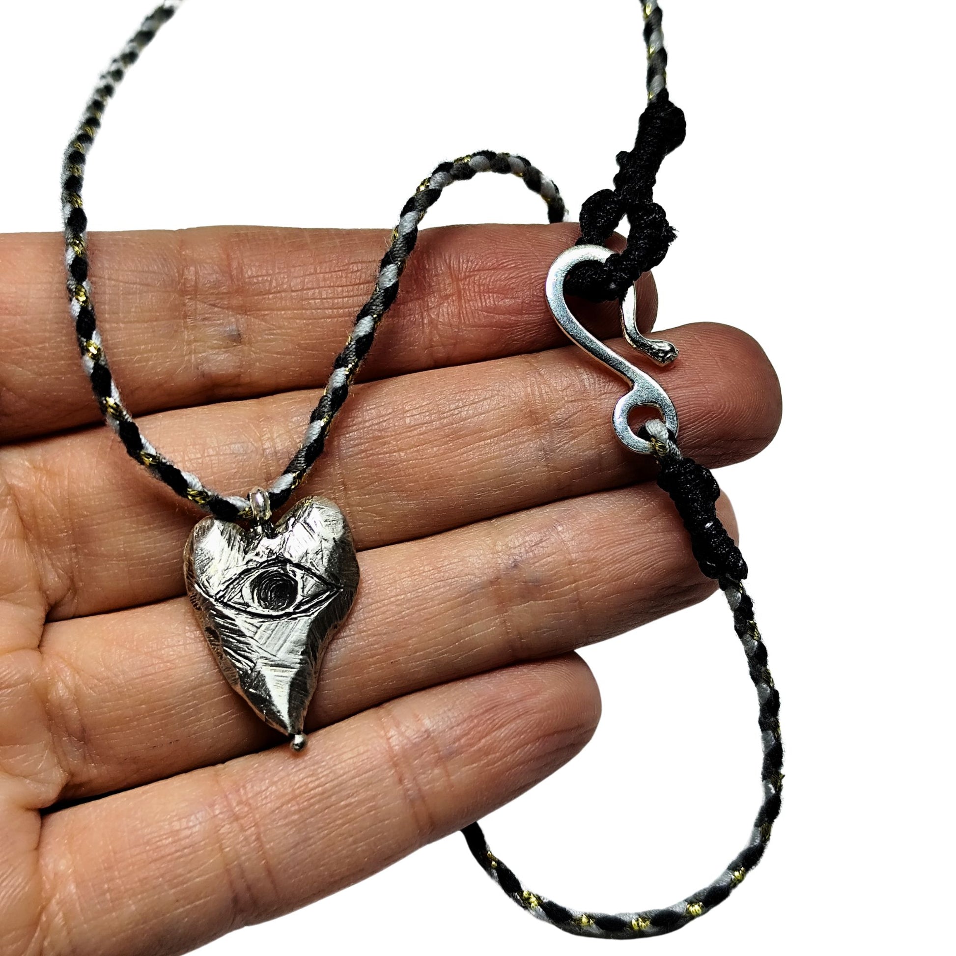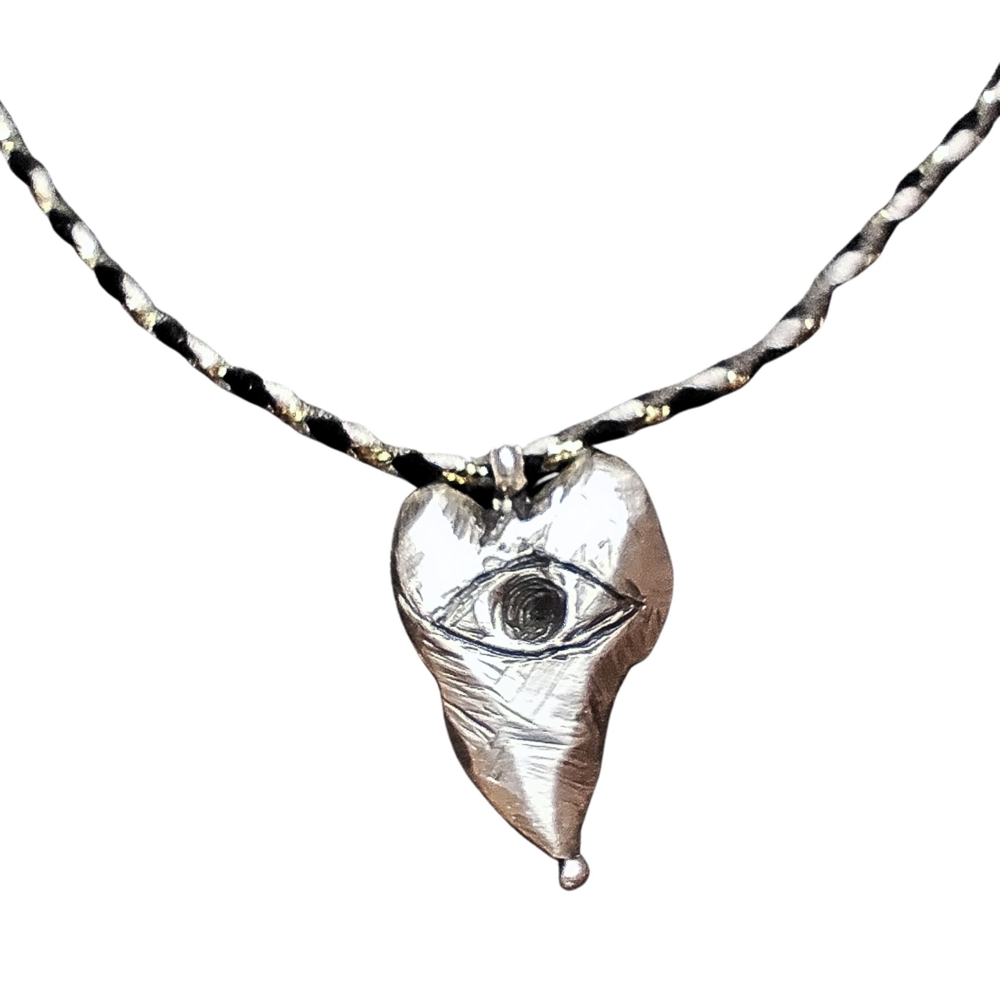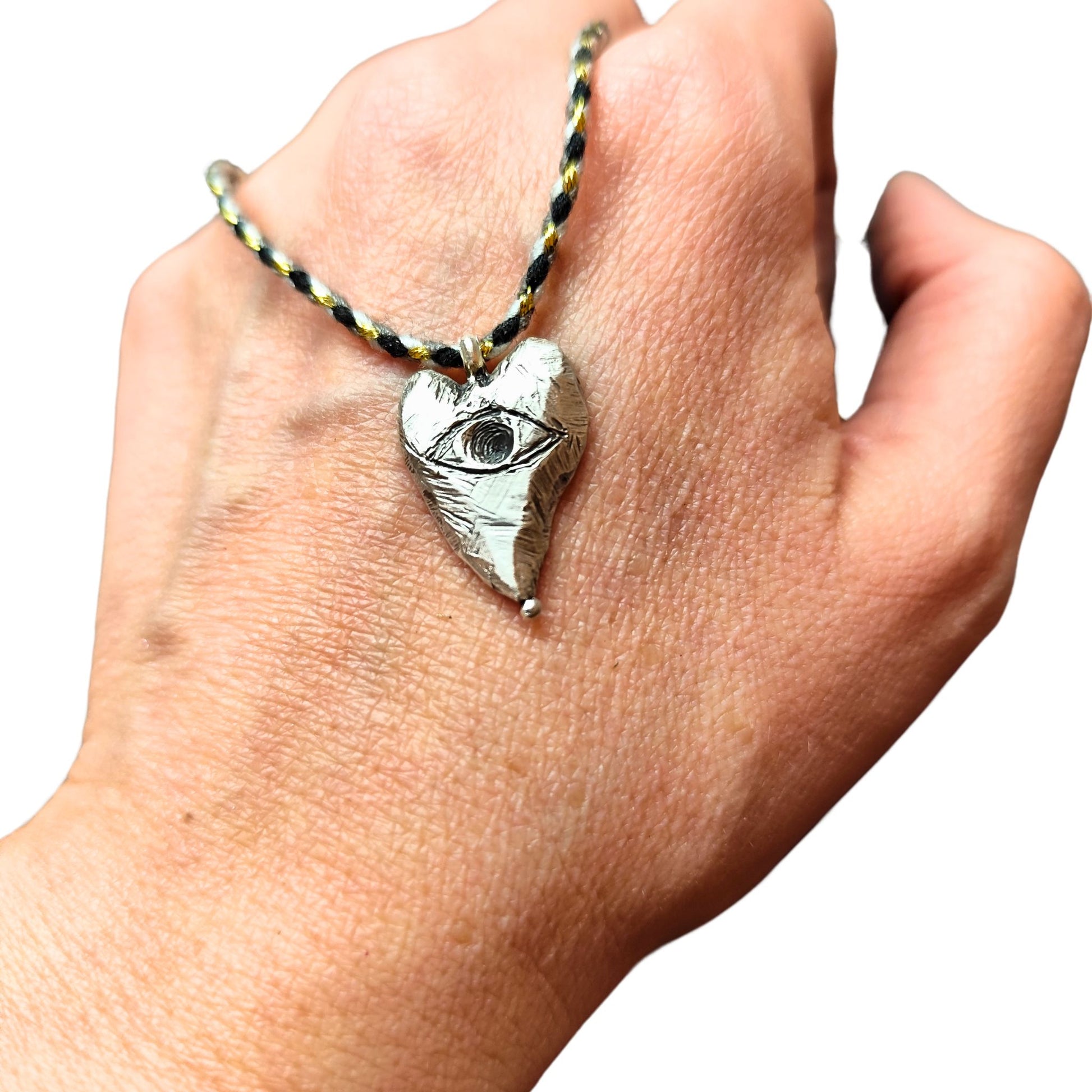 Χειροποίητο από ασήμι 925, το μενταγιόν σε σχήμα καρδιάς φέρει χαραγμένο το διαχρονικό σύμβολο του ματιού – φύλακας και οδηγός.