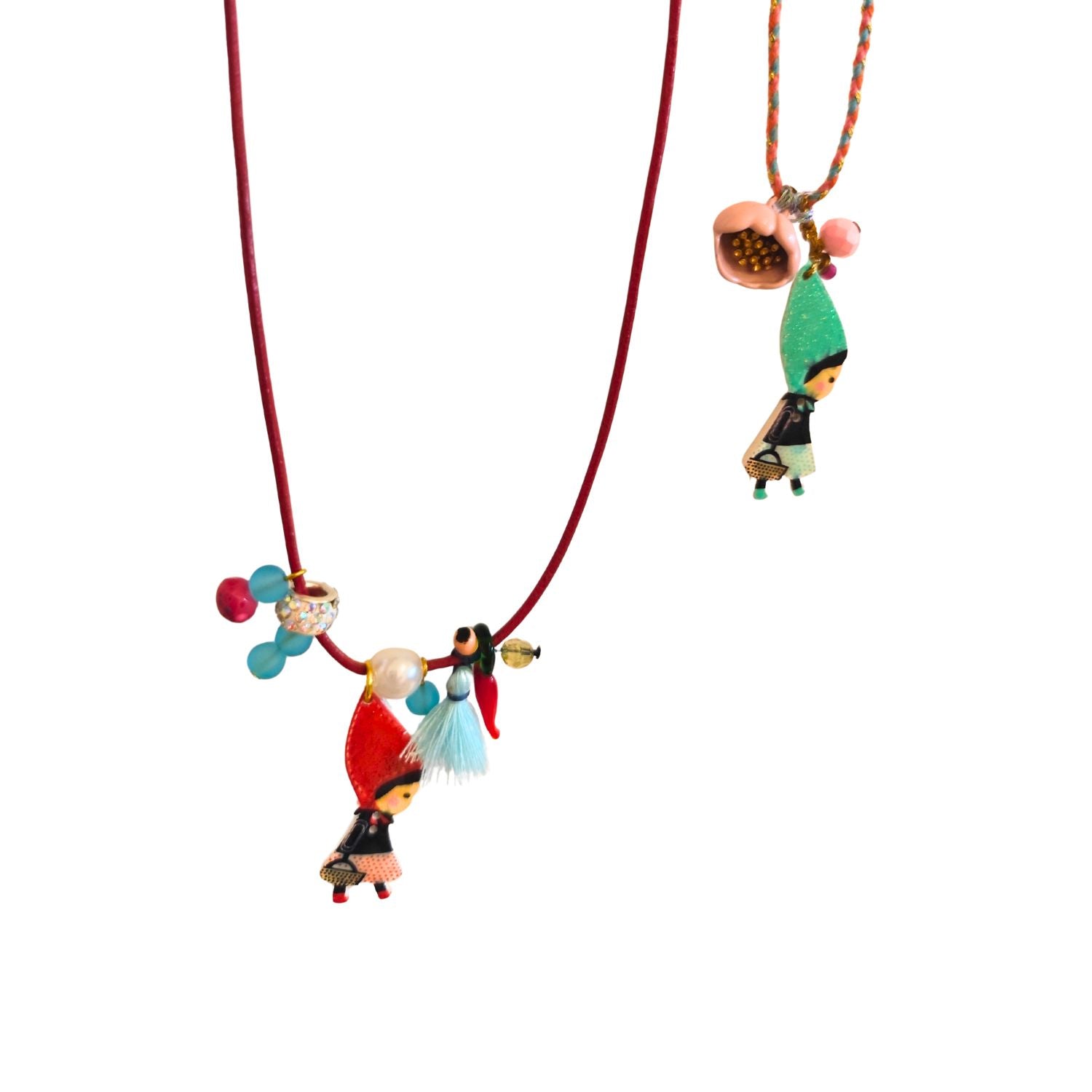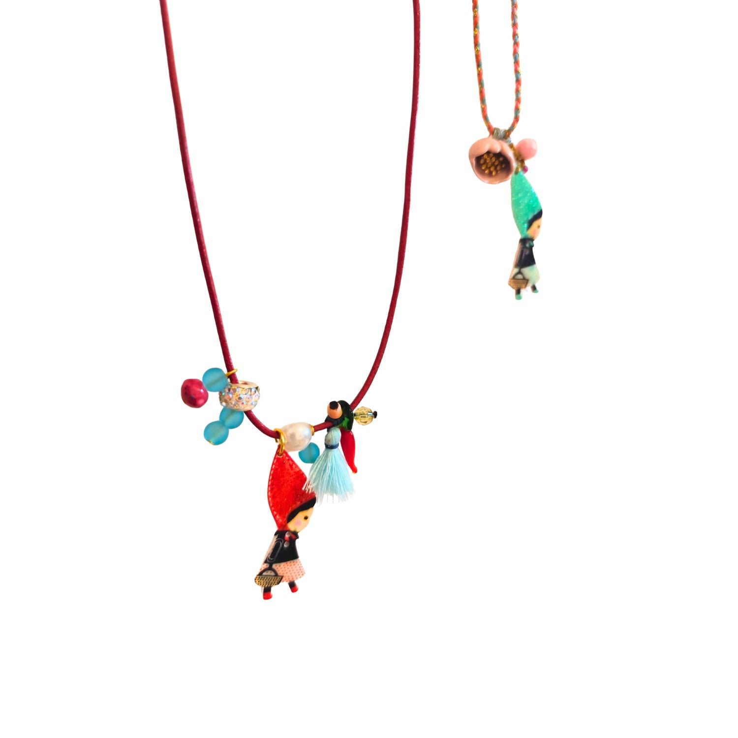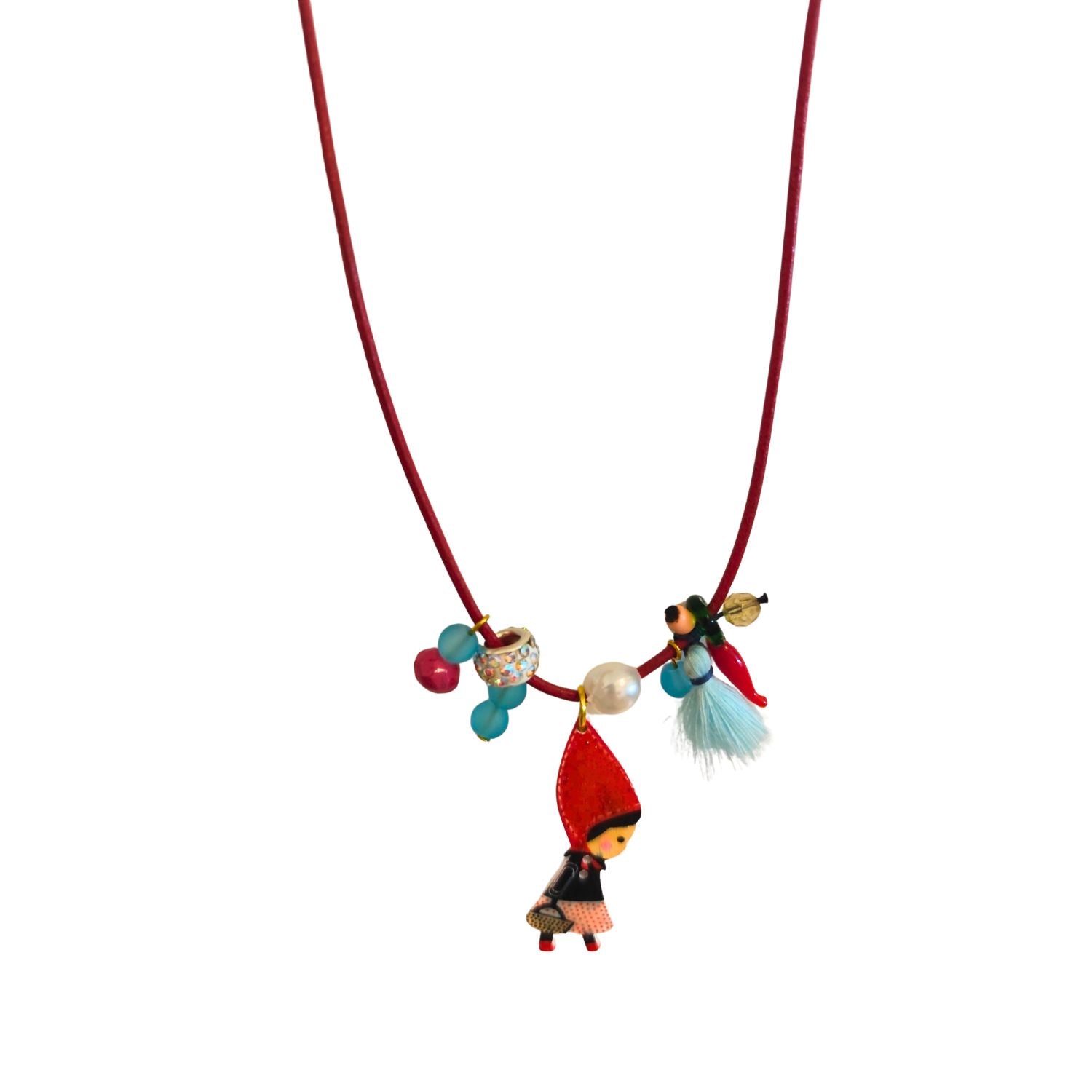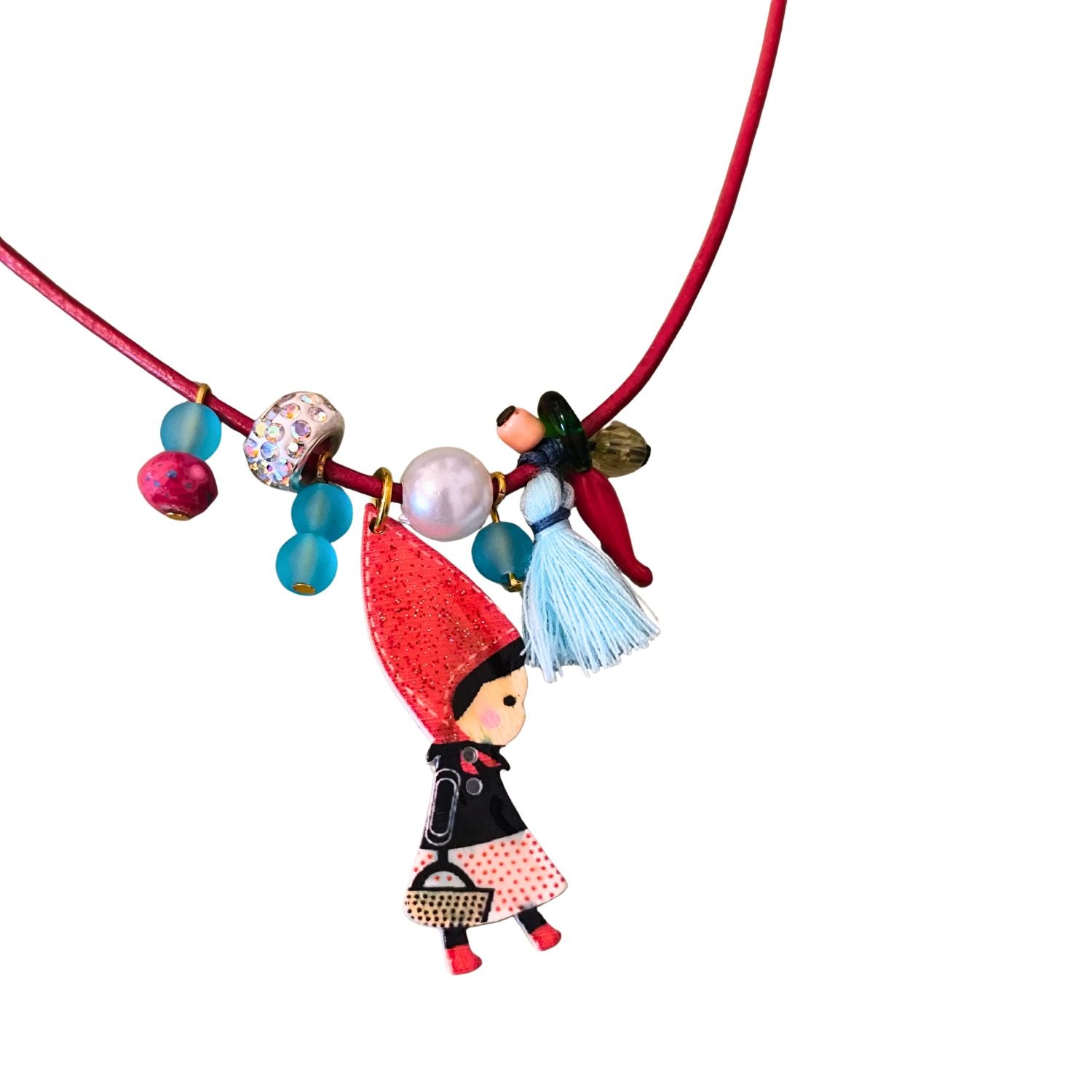 Αυτό το χαριτωμένο κολιέ διαθέτει μια ξύλινη, ζωγραφισμένη φιγούρα της Κοκκινοσκουφίτσας, περασμένη σε μαλακό κορδόνι, ιδανικό για καθημερινή χρήση. Ελαφρύ, πολύχρωμο και γεμάτο παραμυθένια γοητεία, είναι το τέλειο αξεσουάρ για κάθε μικρό ονειροπόλο. Το μήκος αυξομειώνεται εύκολα (κούμπωμα sliding knots). Επιλογή ανάμεσα σε διάφορα χρώματα.