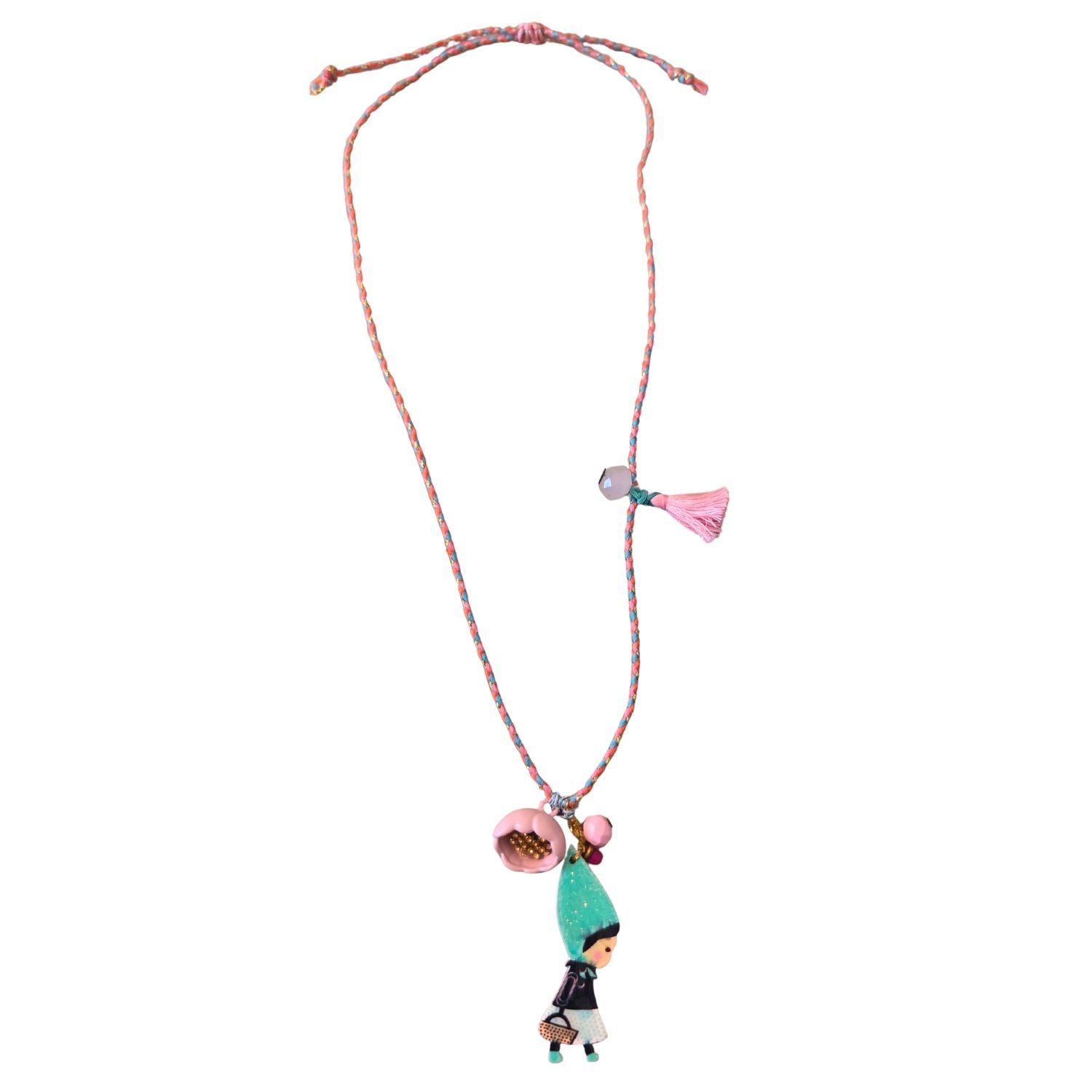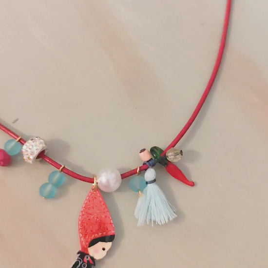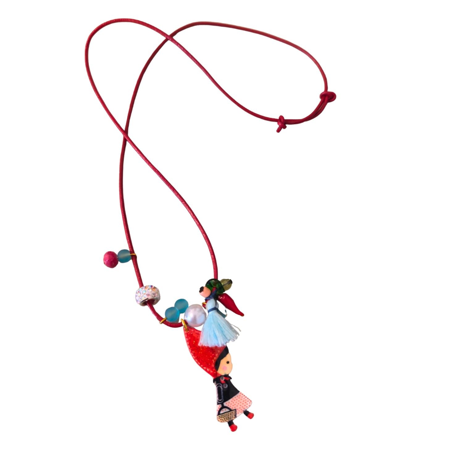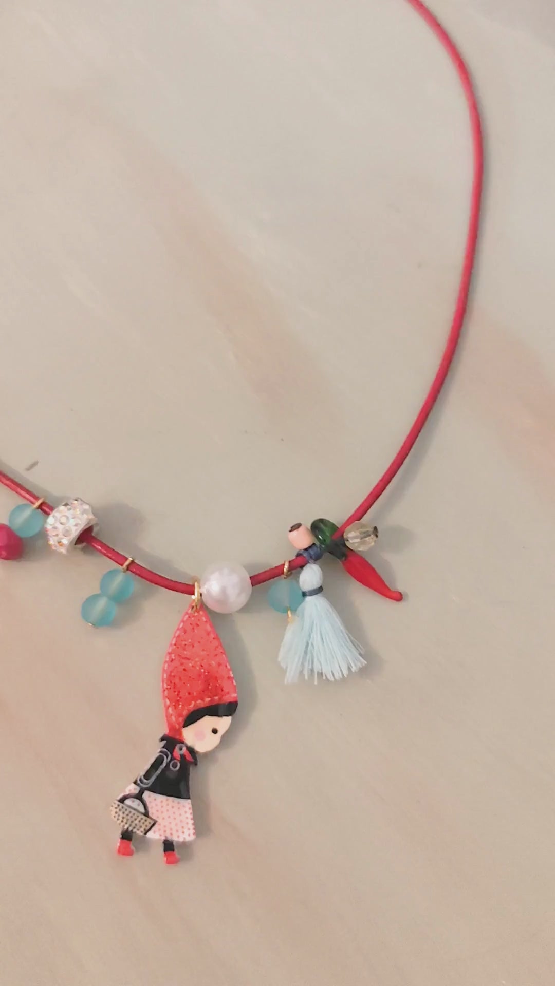 Αυτό το χαριτωμένο κολιέ διαθέτει μια ξύλινη, ζωγραφισμένη φιγούρα της Κοκκινοσκουφίτσας, περασμένη σε μαλακό κορδόνι, ιδανικό για καθημερινή χρήση. Ελαφρύ, πολύχρωμο και γεμάτο παραμυθένια γοητεία, είναι το τέλειο αξεσουάρ για κάθε μικρό ονειροπόλο. Το μήκος αυξομειώνεται εύκολα (κούμπωμα sliding knots). Επιλογή ανάμεσα σε διάφορα χρώματα.