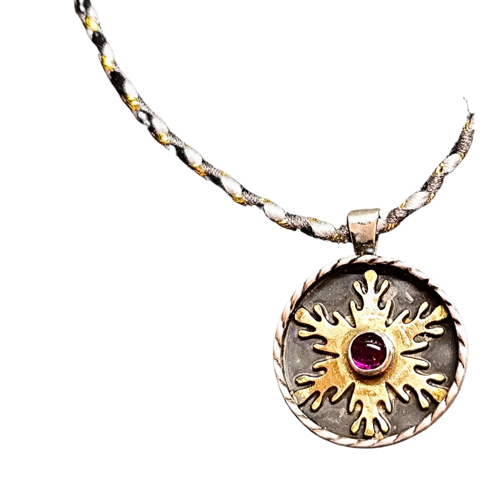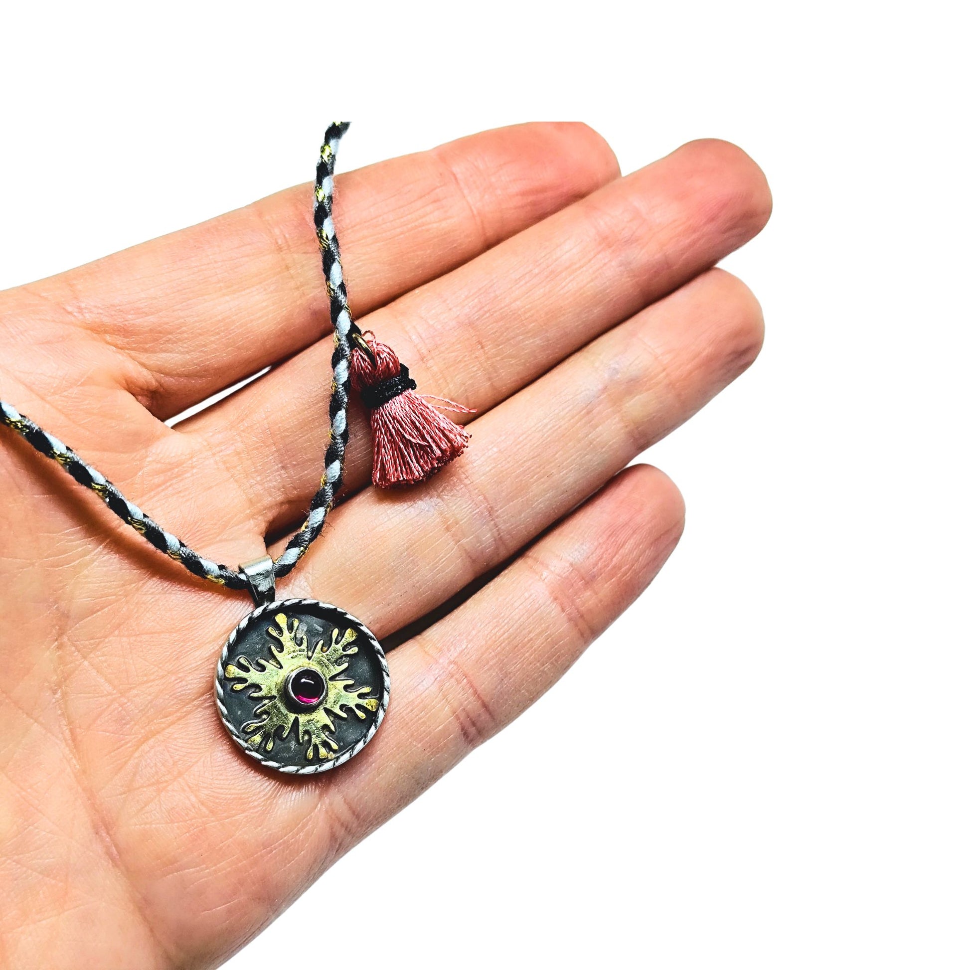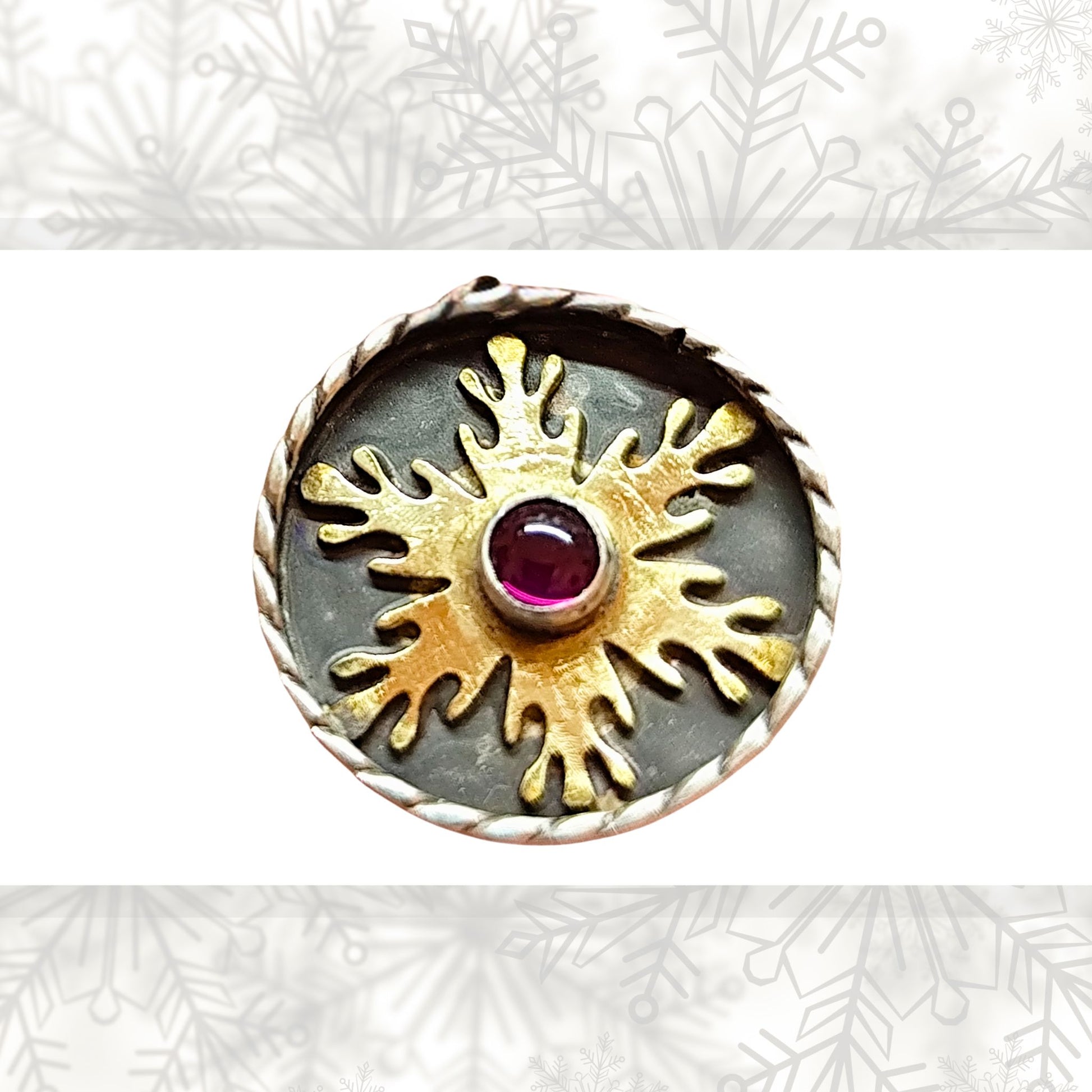 Χειροποίητο κόσμημα με σχέδιο χιονονιφάδας από ορείχαλκο, σε σκούρα βάση από ασήμι, και ένα συνθετικό ρουμπίνι στο κέντρο που θυμίζει χειμωνιάτικο καρπό.