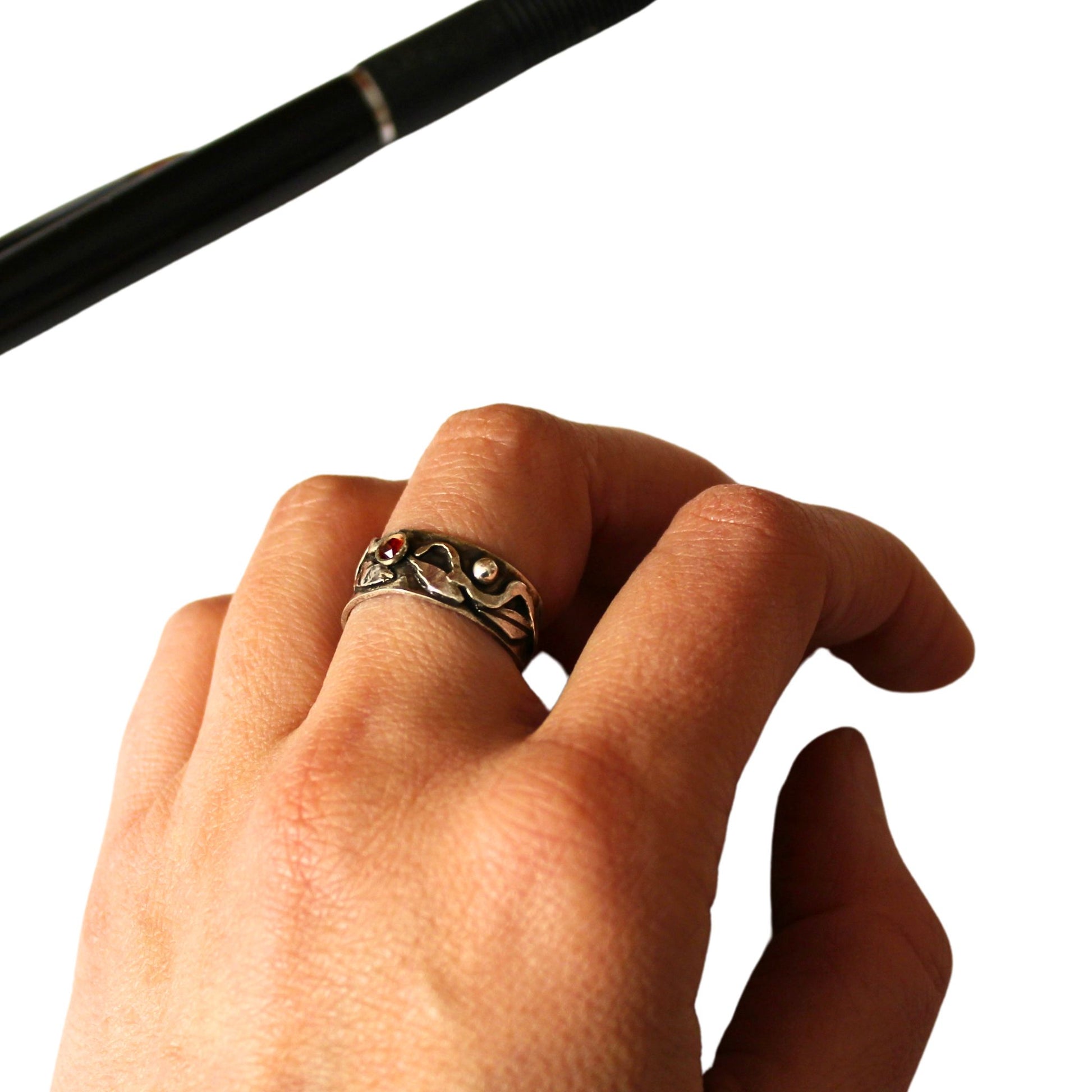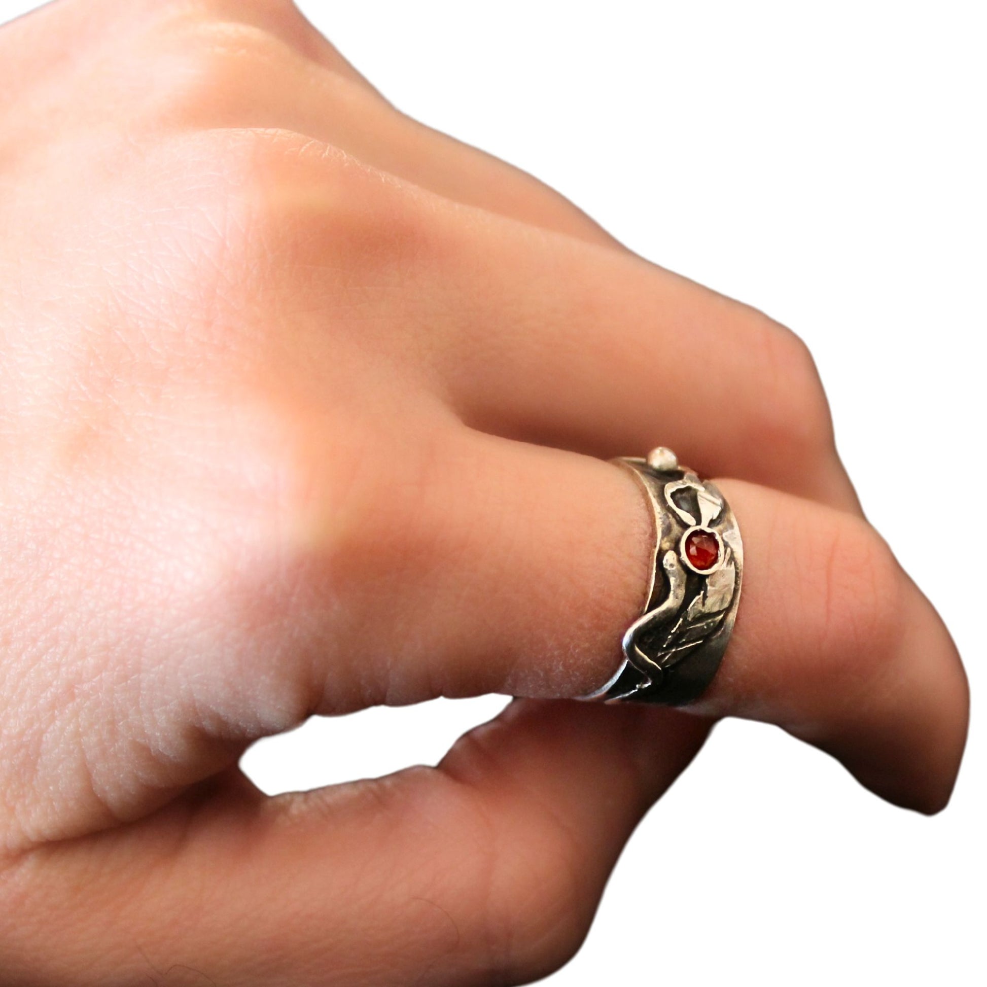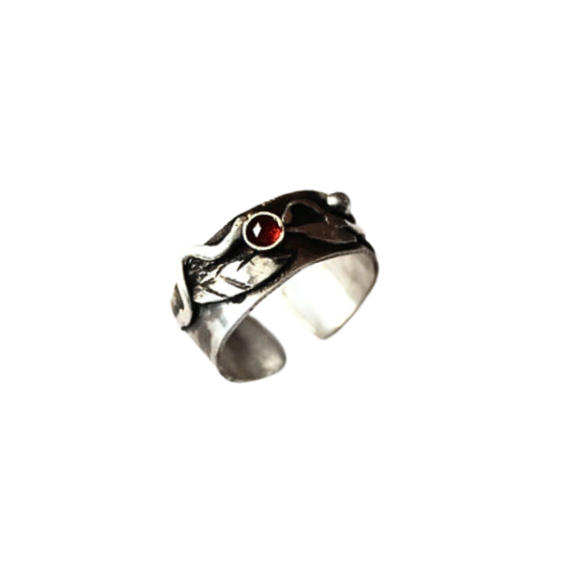 Ένα ασημένιο δαχτυλίδι με άνοιγμα, διακοσμημένο με βαθύ κόκκινο γρανάτη που ενσωματώνεται αρμονικά στη γλυπτική, ανάγλυφη επιφάνειά του. Η φαρδιά του μορφή αγκαλιάζει το δάχτυλο προσφέροντας ένα κομψό στυλ. Μοναδικό και δυναμικό — όπως εσύ.