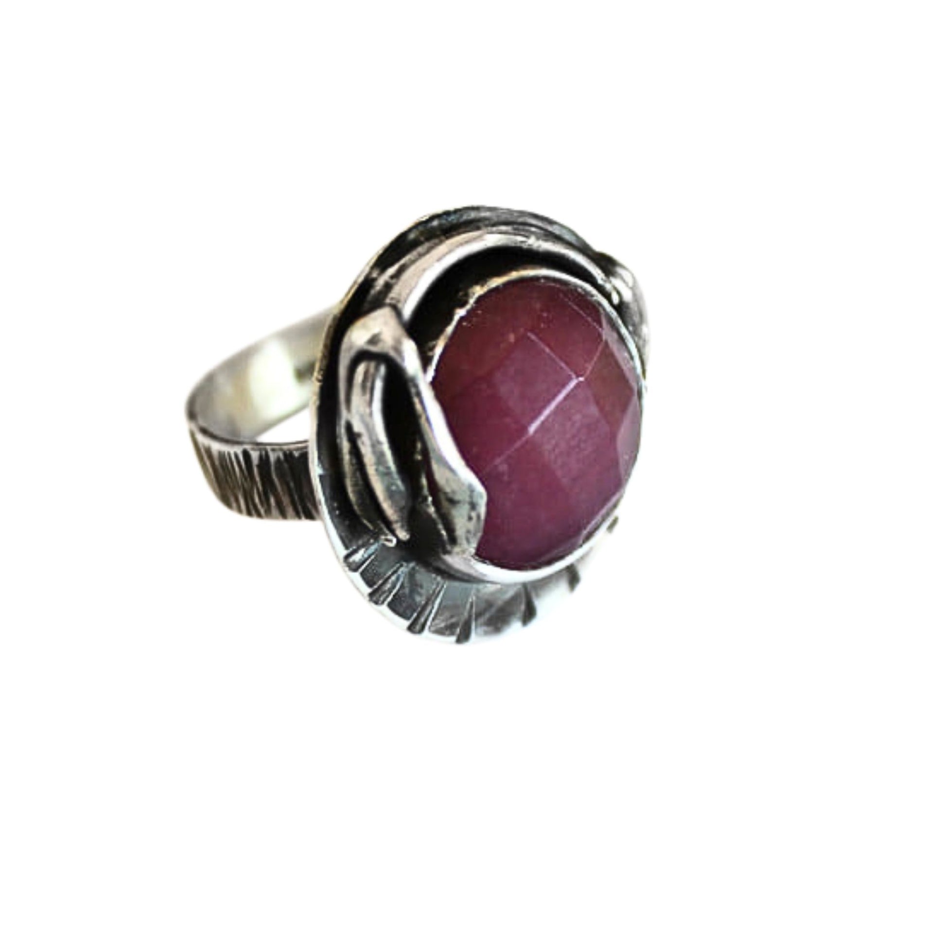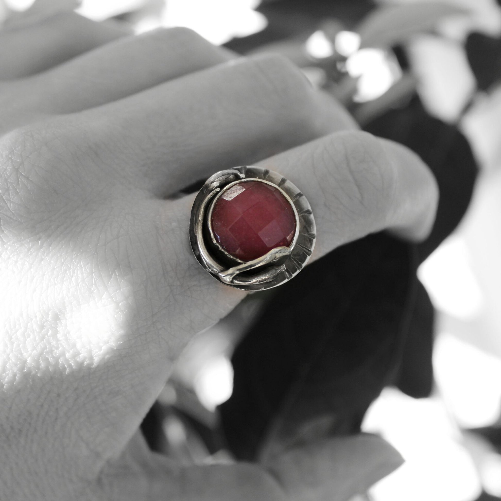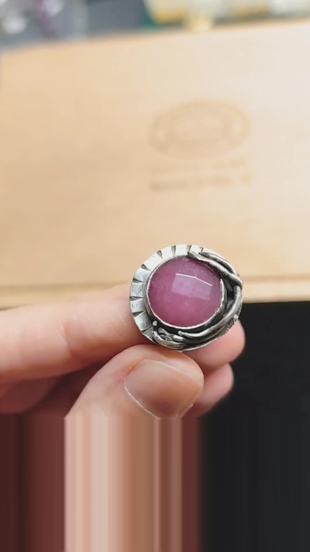 Απαλό και φωτεινό, αυτό το χειροποίητο δαχτυλίδι φιλοξενεί στο κέντρο του ένα υπέροχο ροζ Νεφρίτη (Jade) — μια πέτρα γνωστή για την ήρεμη ενέργεια και τη διακριτική της ζεστασιά. Τοποθετημένο σε μια ασημένια βάση με λεπτομέρειες εμπνευσμένες από τη φύση, αποπνέει ισορροπία και χάρη. Ένα μοναδικό statement κομμάτι.