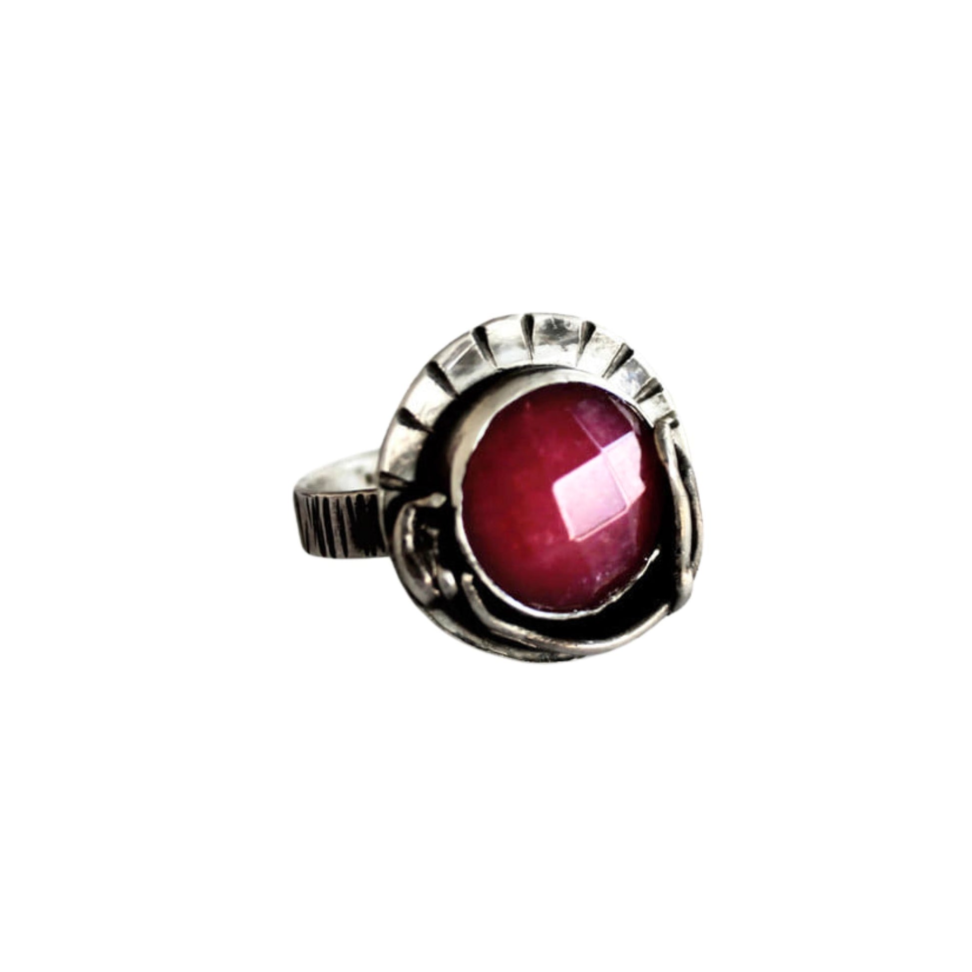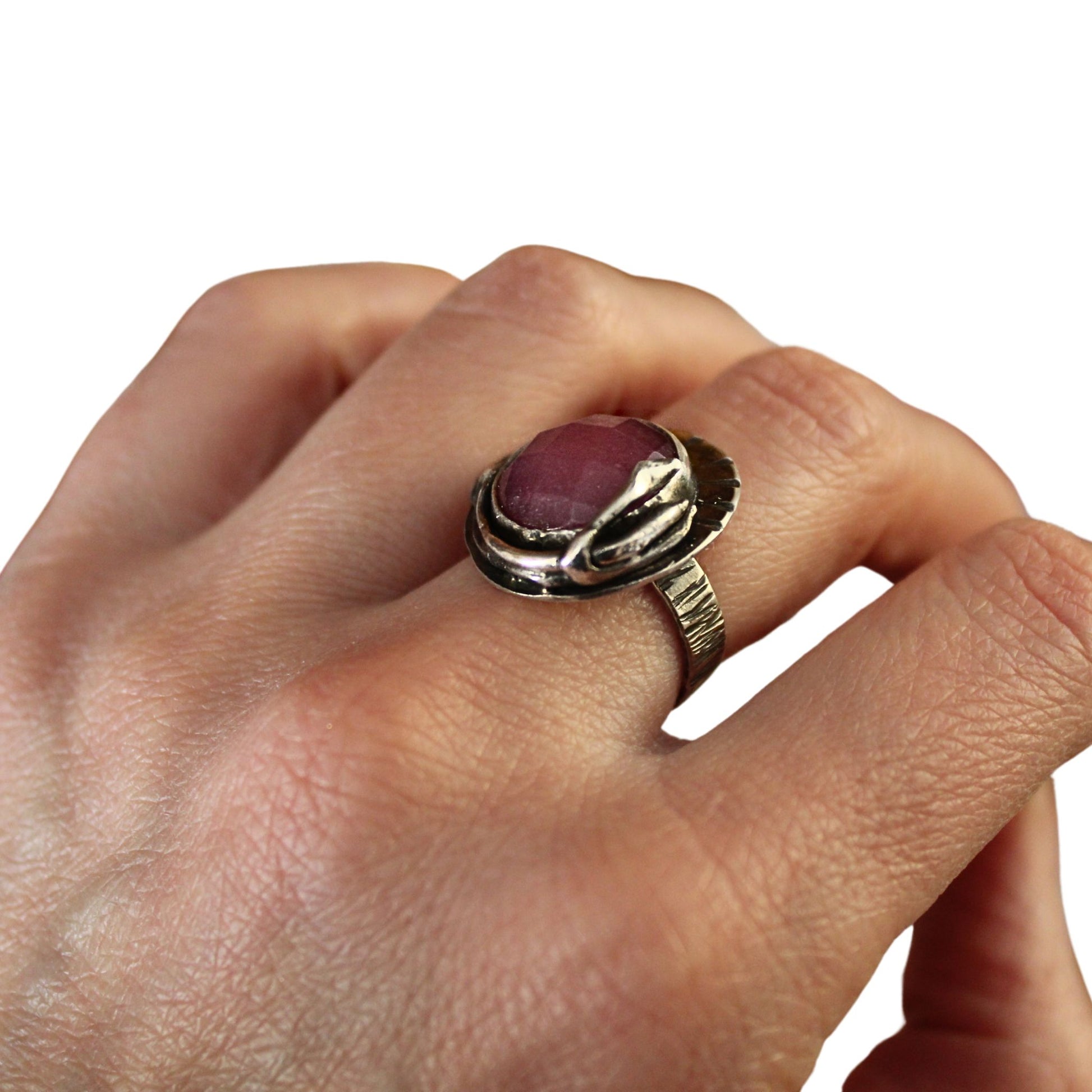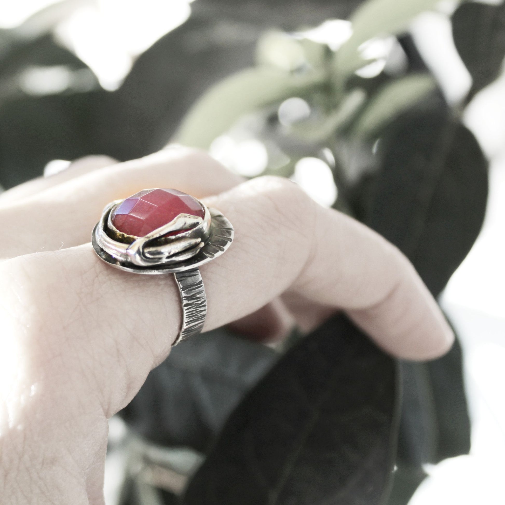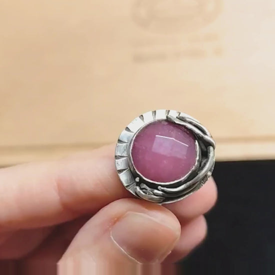 Απαλό και φωτεινό, αυτό το χειροποίητο δαχτυλίδι φιλοξενεί στο κέντρο του ένα υπέροχο ροζ Νεφρίτη (Jade) — μια πέτρα γνωστή για την ήρεμη ενέργεια και τη διακριτική της ζεστασιά. Τοποθετημένο σε μια ασημένια βάση με λεπτομέρειες εμπνευσμένες από τη φύση, αποπνέει ισορροπία και χάρη. Ένα μοναδικό statement κομμάτι.
