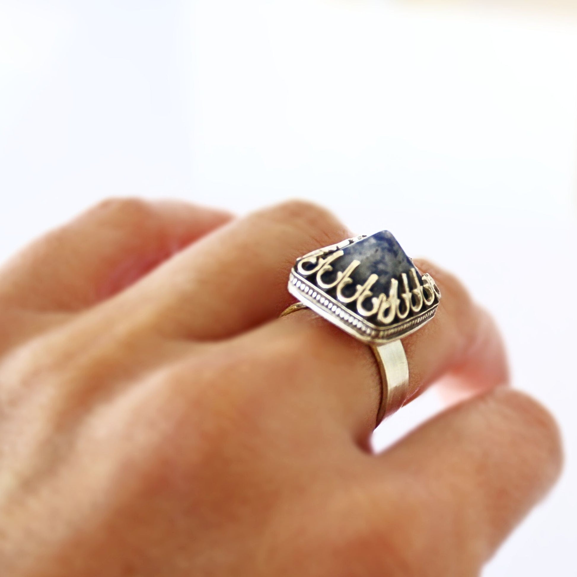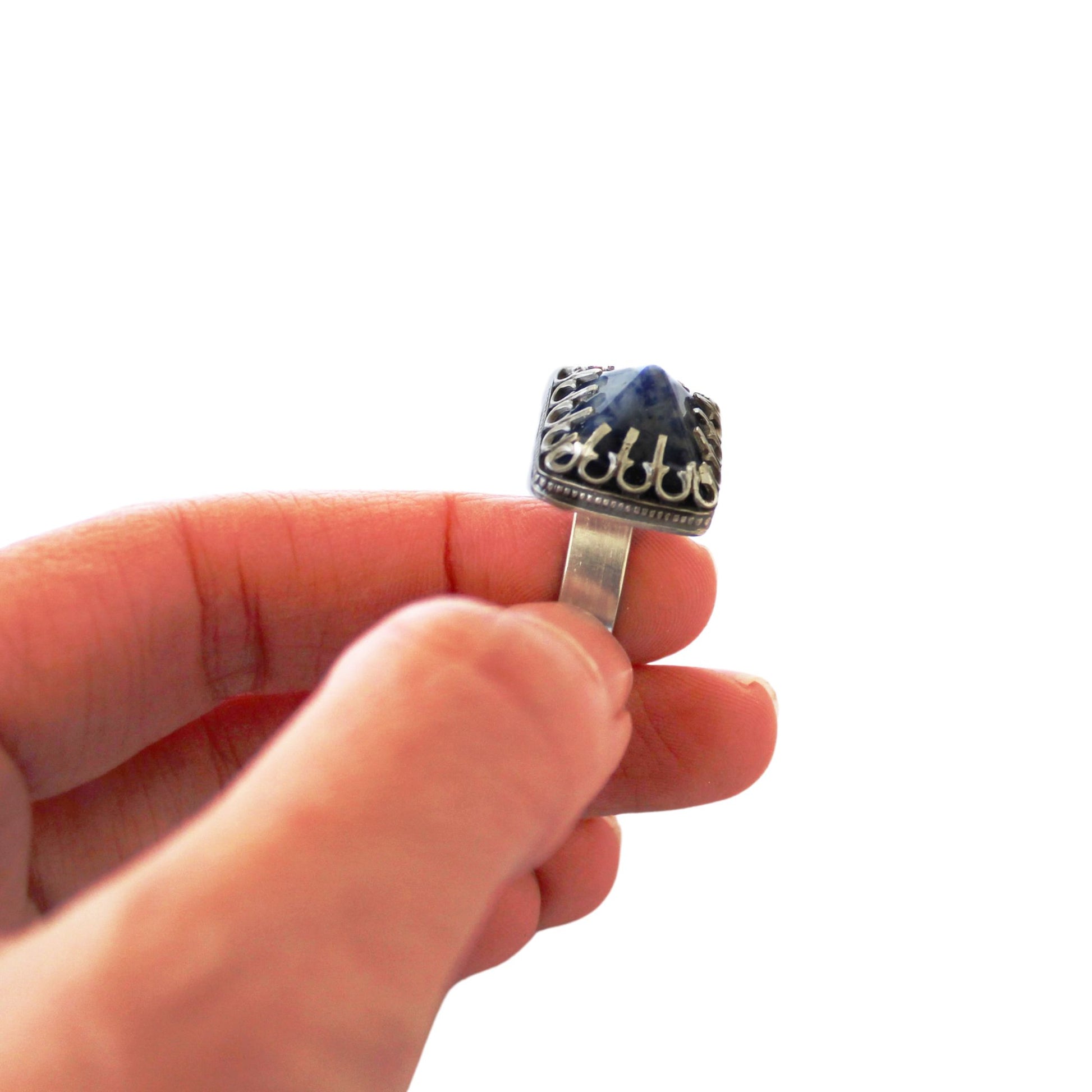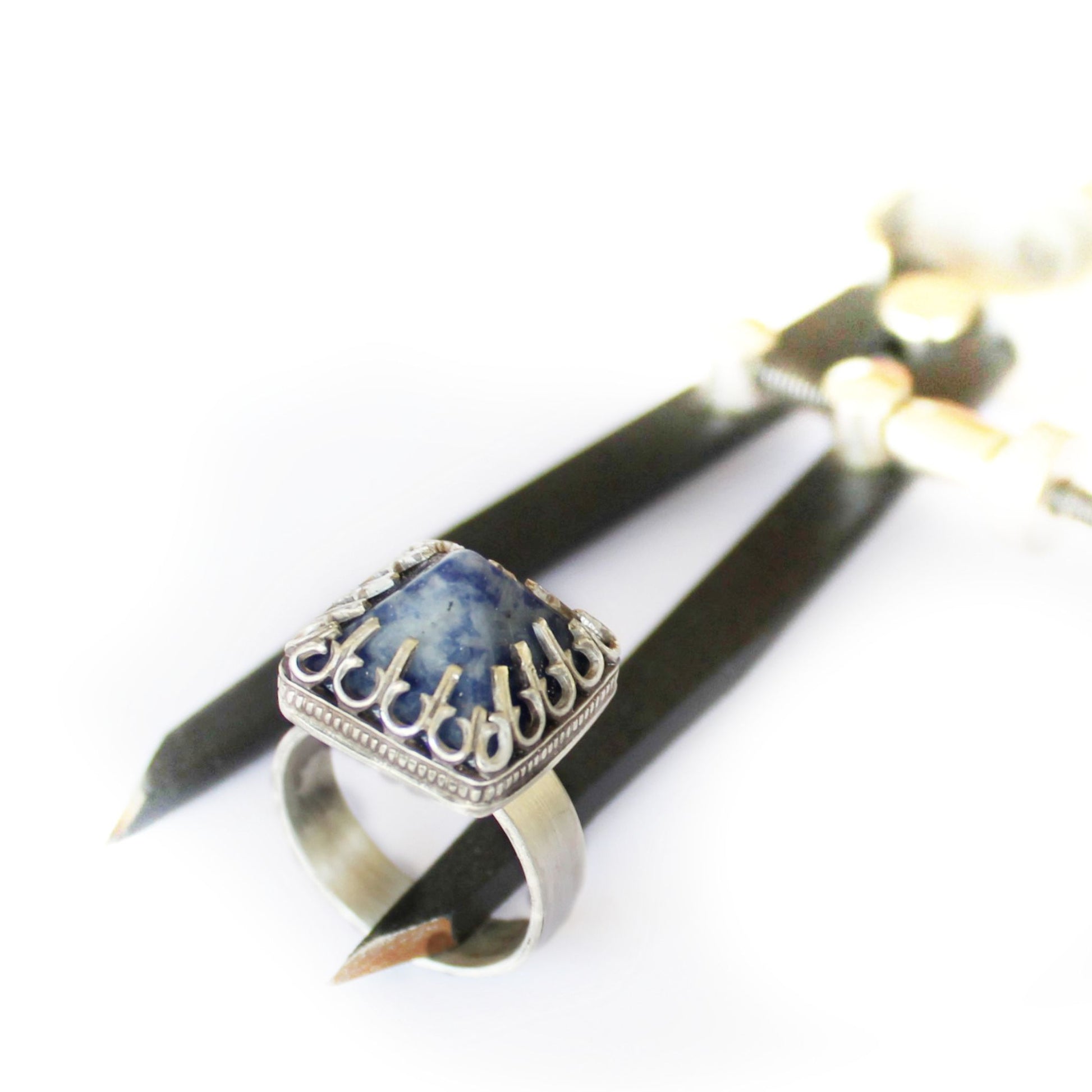 Ένα εντυπωσιακό δαχτυλίδι με πέτρα σοδαλίτη κομμένη σε σχήμα πυραμίδας, γνωστή για τις βαθιές μπλε αποχρώσεις και την ενέργεια γείωσης που προσφέρει. Τοποθετημένη σε περίτεχνη, χειροποίητη βάση, η δημιουργία αυτή συνδυάζει τη δομή με το πνεύμα — ένα φορέσιμο σύμβολο διαύγειας και διαίσθησης.