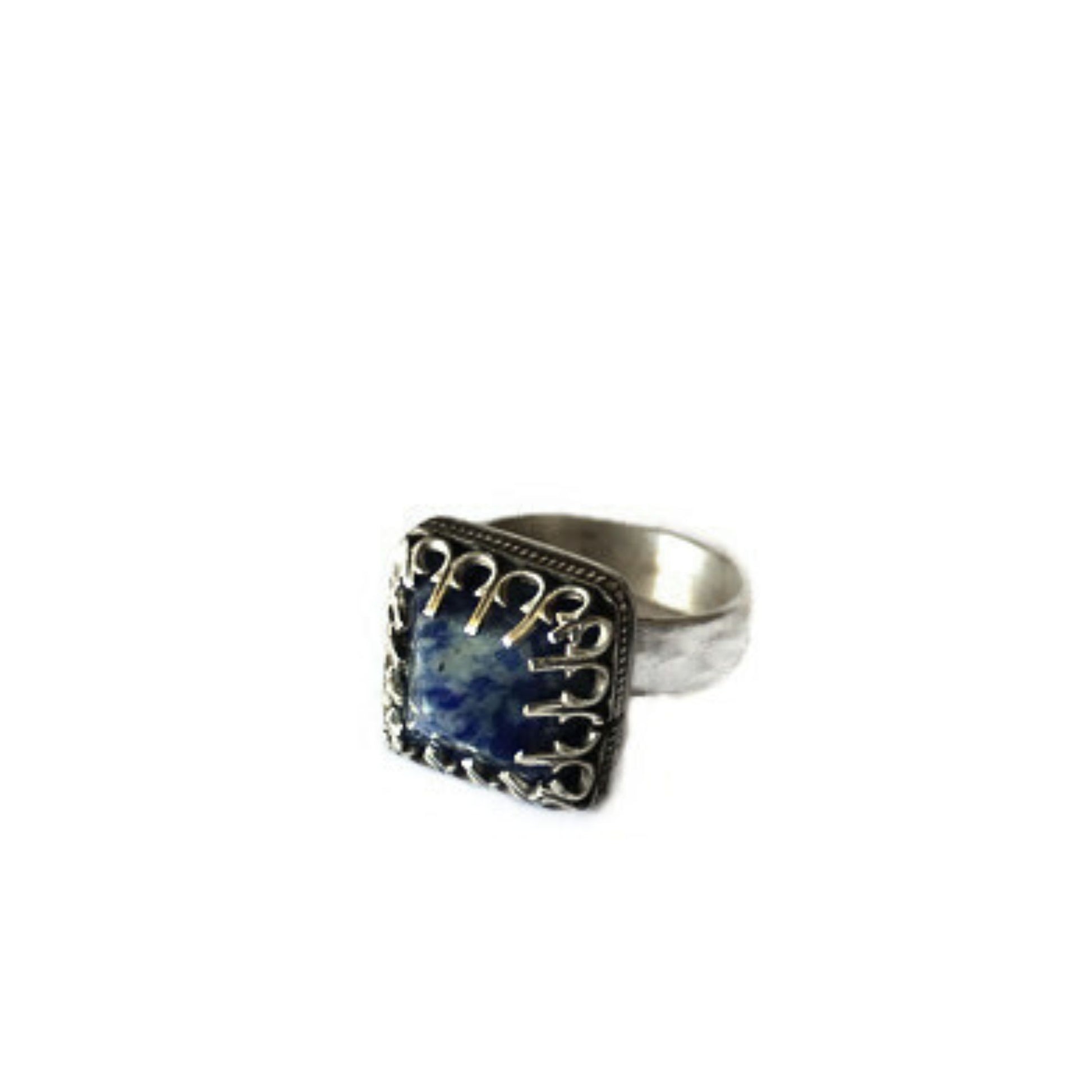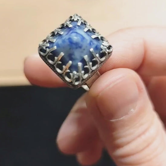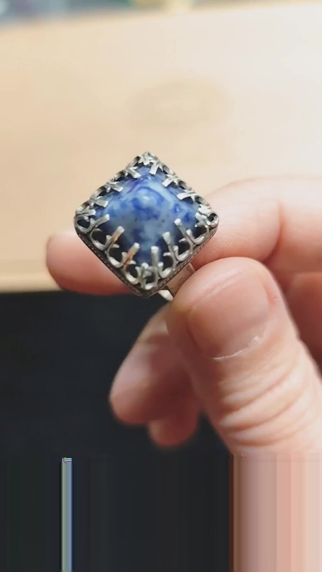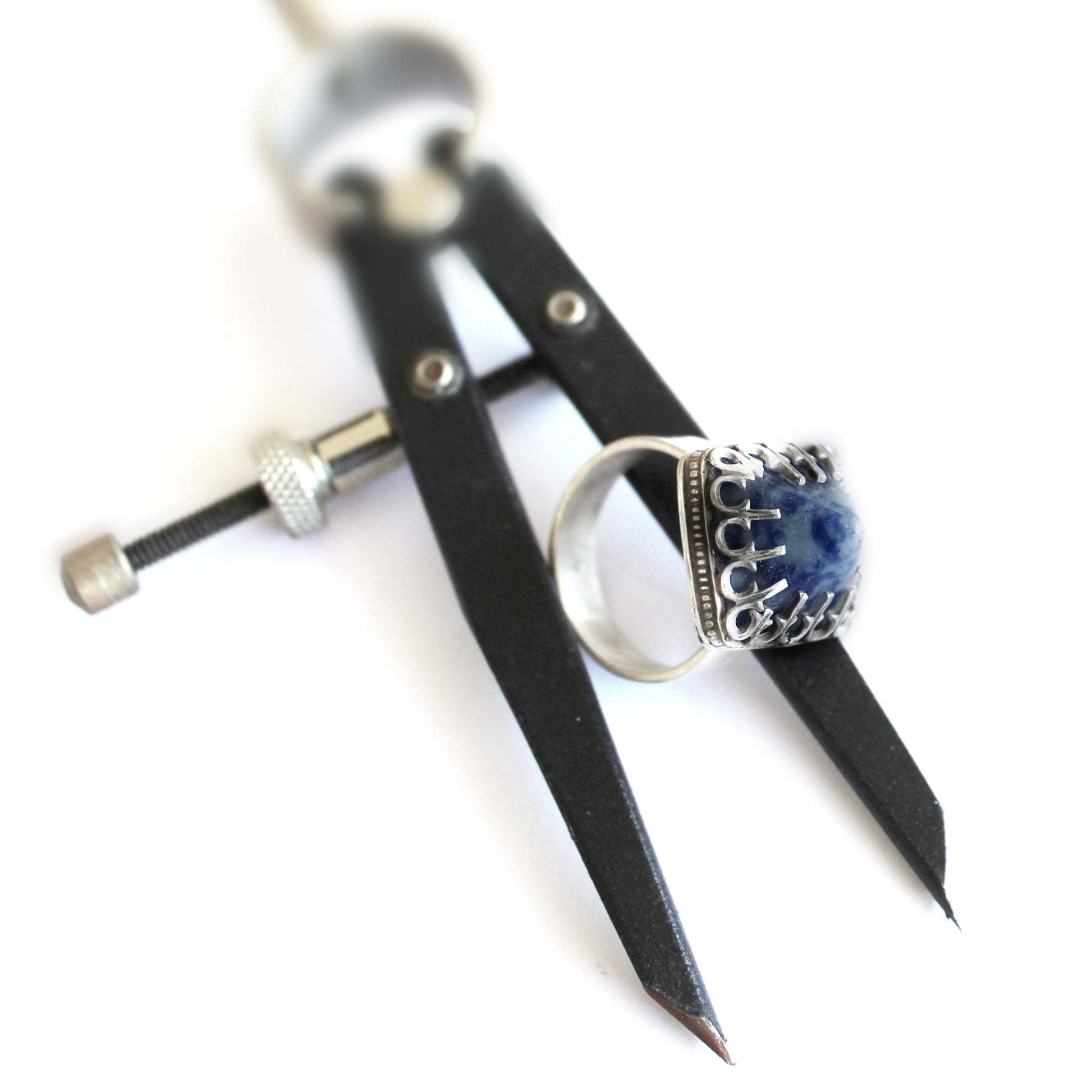 Ένα εντυπωσιακό δαχτυλίδι με πέτρα σοδαλίτη κομμένη σε σχήμα πυραμίδας, γνωστή για τις βαθιές μπλε αποχρώσεις και την ενέργεια γείωσης που προσφέρει. Τοποθετημένη σε περίτεχνη, χειροποίητη βάση, η δημιουργία αυτή συνδυάζει τη δομή με το πνεύμα — ένα φορέσιμο σύμβολο διαύγειας και διαίσθησης.