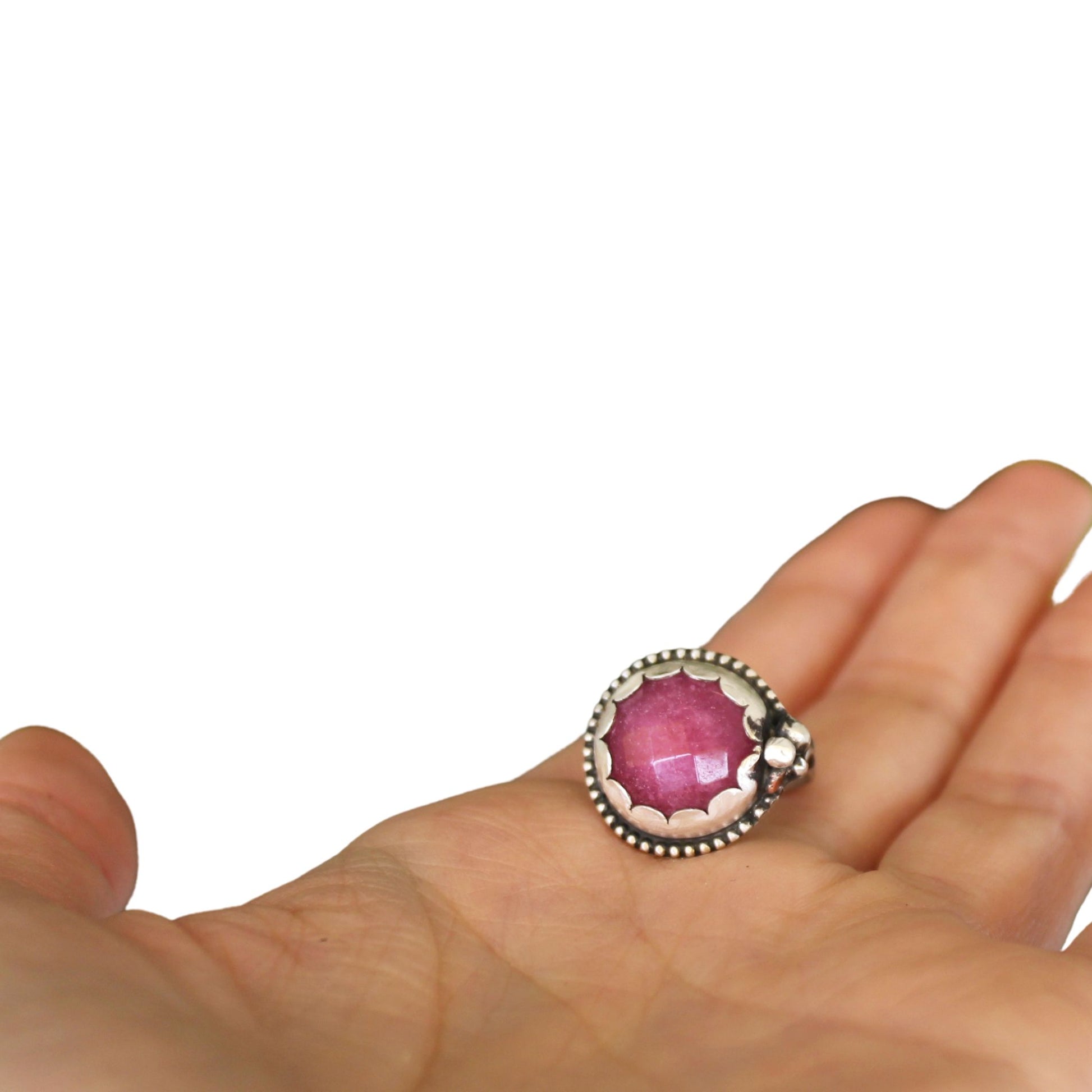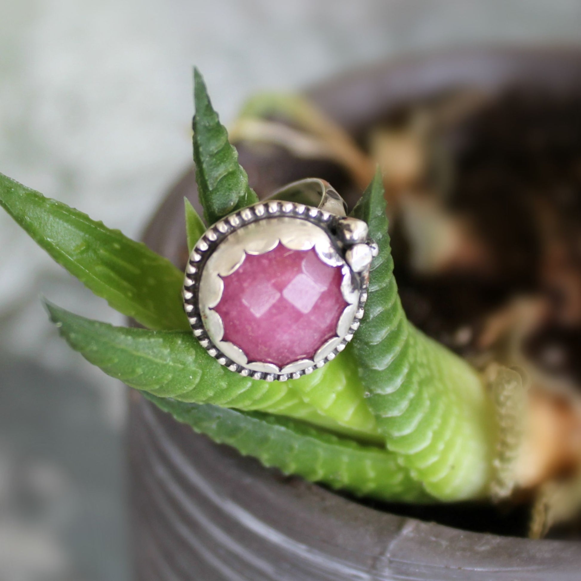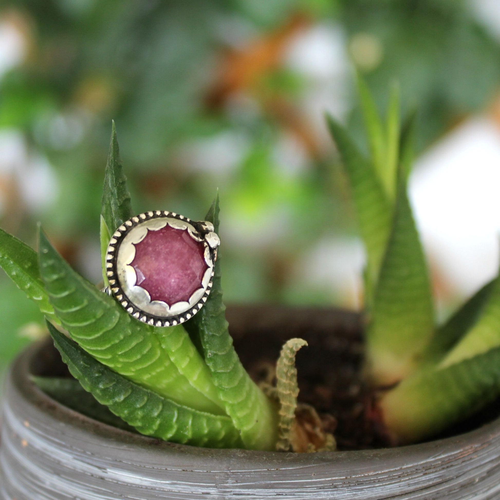 Απαλό και φωτεινό, αυτό το χειροποίητο δαχτυλίδι φιλοξενεί στο κέντρο του ένα υπέροχο ροζ Νεφρίτη (Jade) — μια πέτρα γνωστή για την ήρεμη ενέργεια και τη διακριτική της ζεστασιά. Τοποθετημένο σε μια ανάγλυφη ασημένια βάση με φυσικές γραμμές, αποπνέει ισορροπία και χάρη. Μια διακριτική αλλά δυναμική δήλωση κομψότητας.