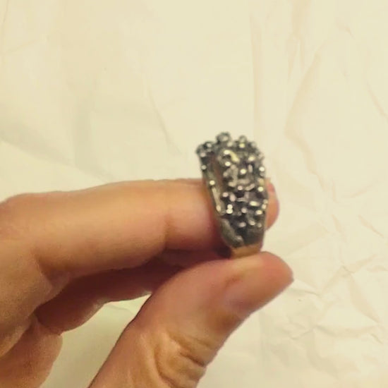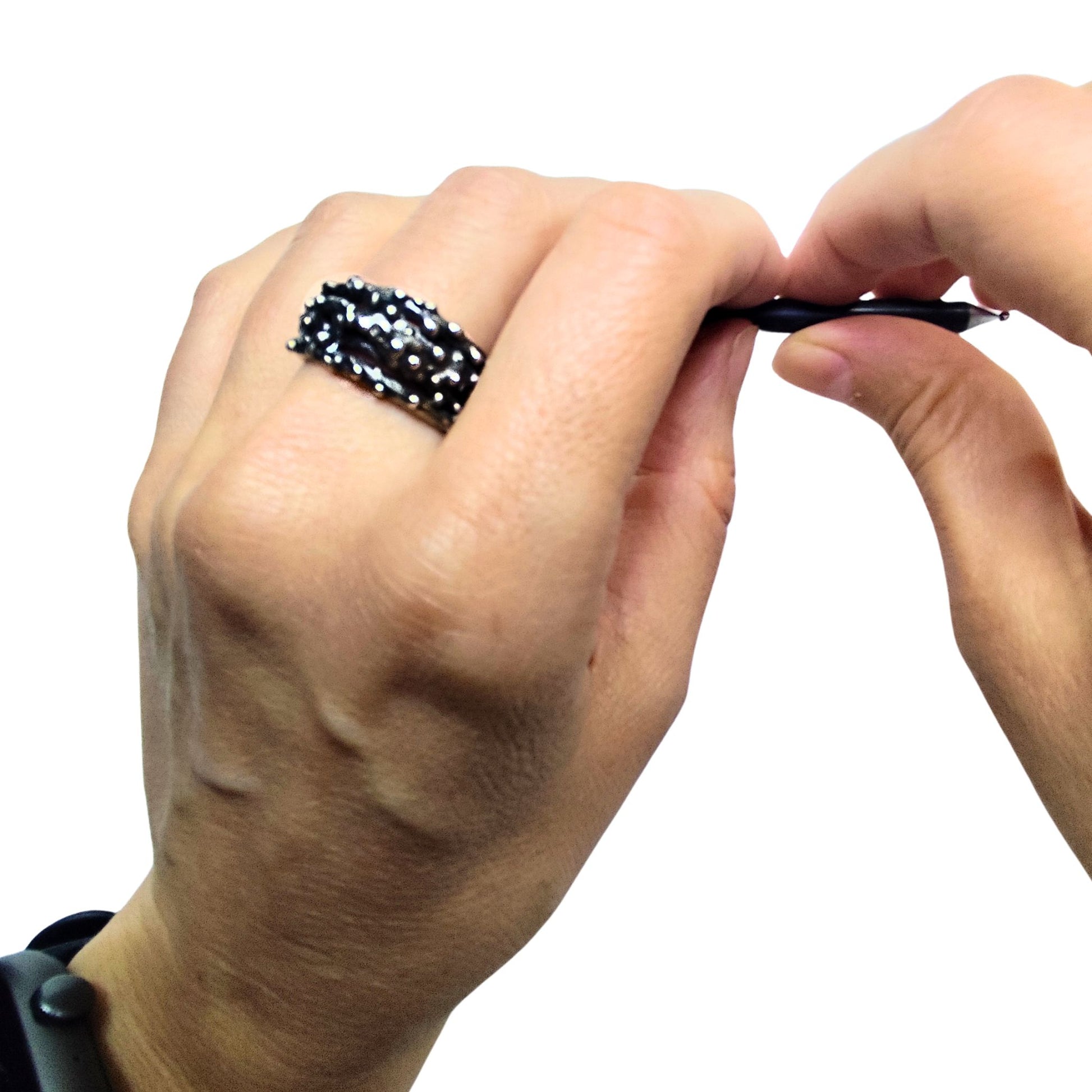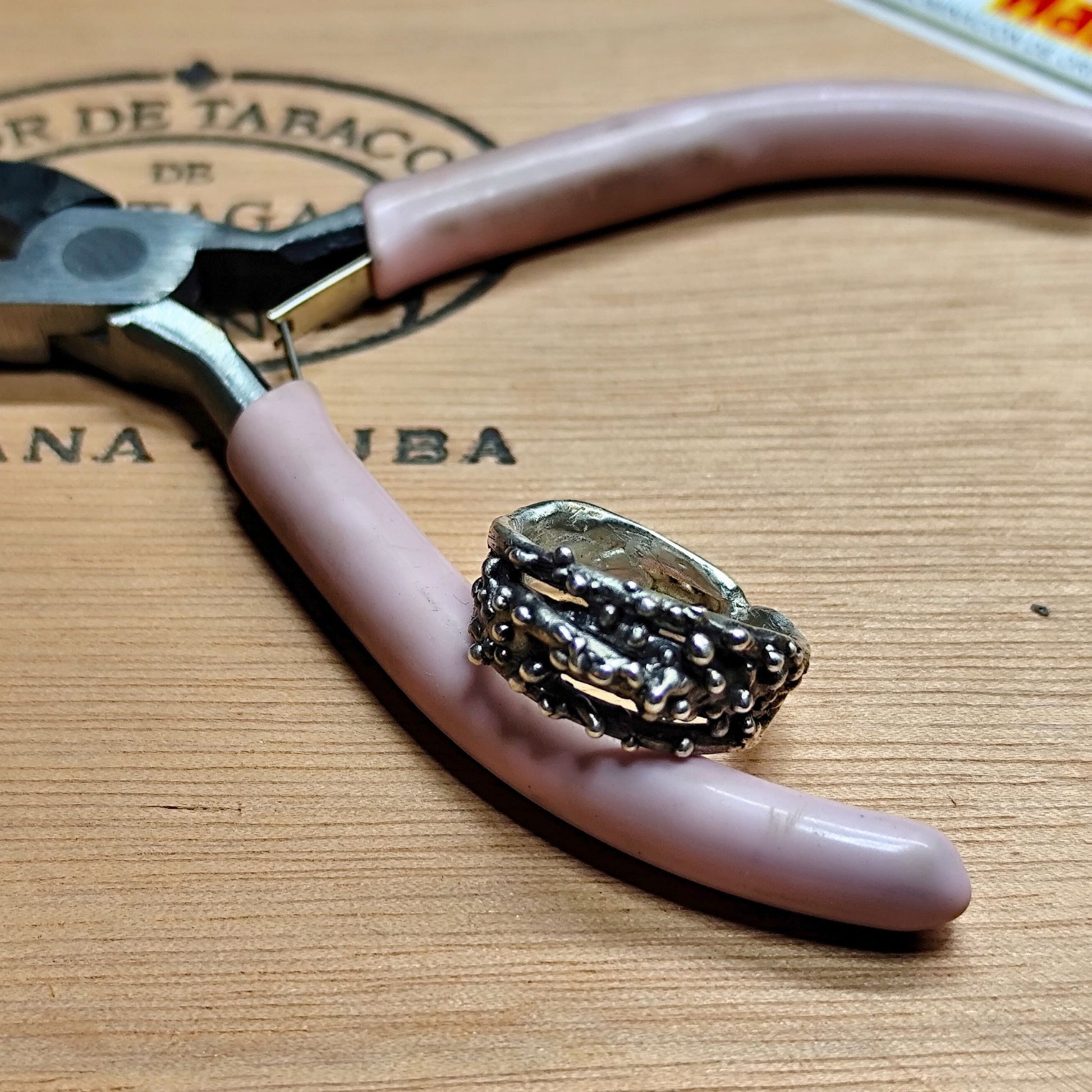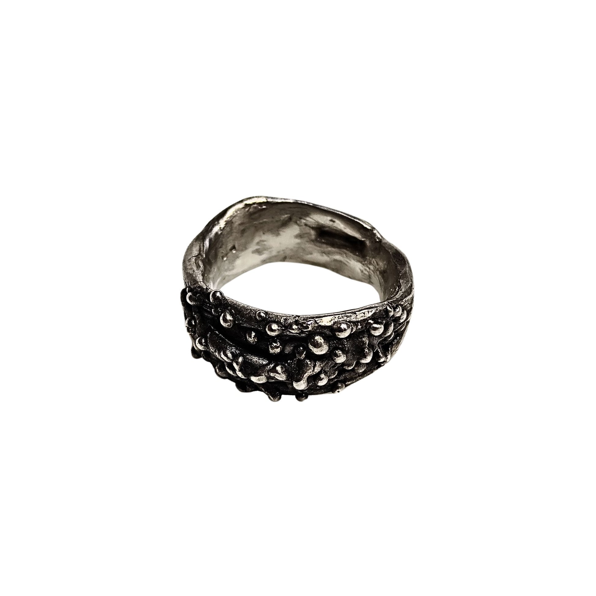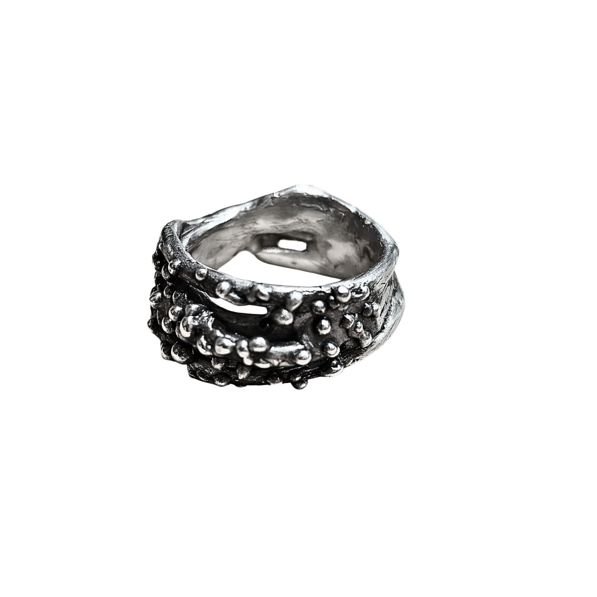 Αυτό το χειροποίητο δαχτυλίδι εντυπωσιάζει με τη φυσική υφή και την τολμηρή του παρουσία. Εμπνευσμένο από οργανικές φόρμες και τη μοντέρνα τέχνη, αγκαλιάζει το δάχτυλο σαν ρευστό ασήμι. Ιδανικό για όσους αγαπούν το ξεχωριστό και καλλιτεχνικό ύφος.