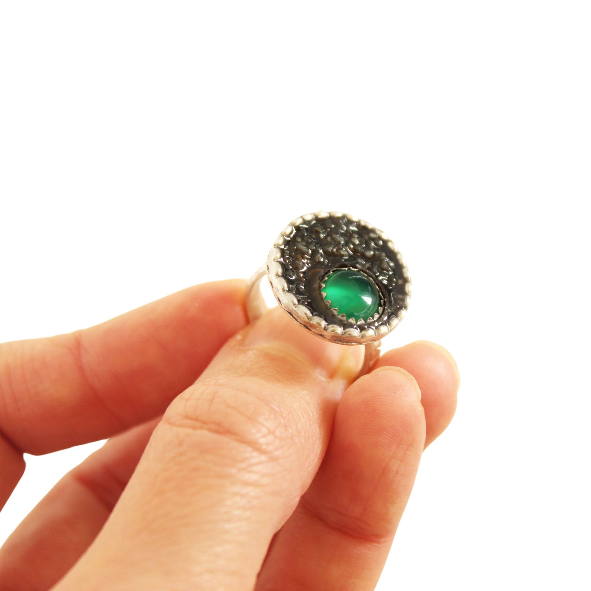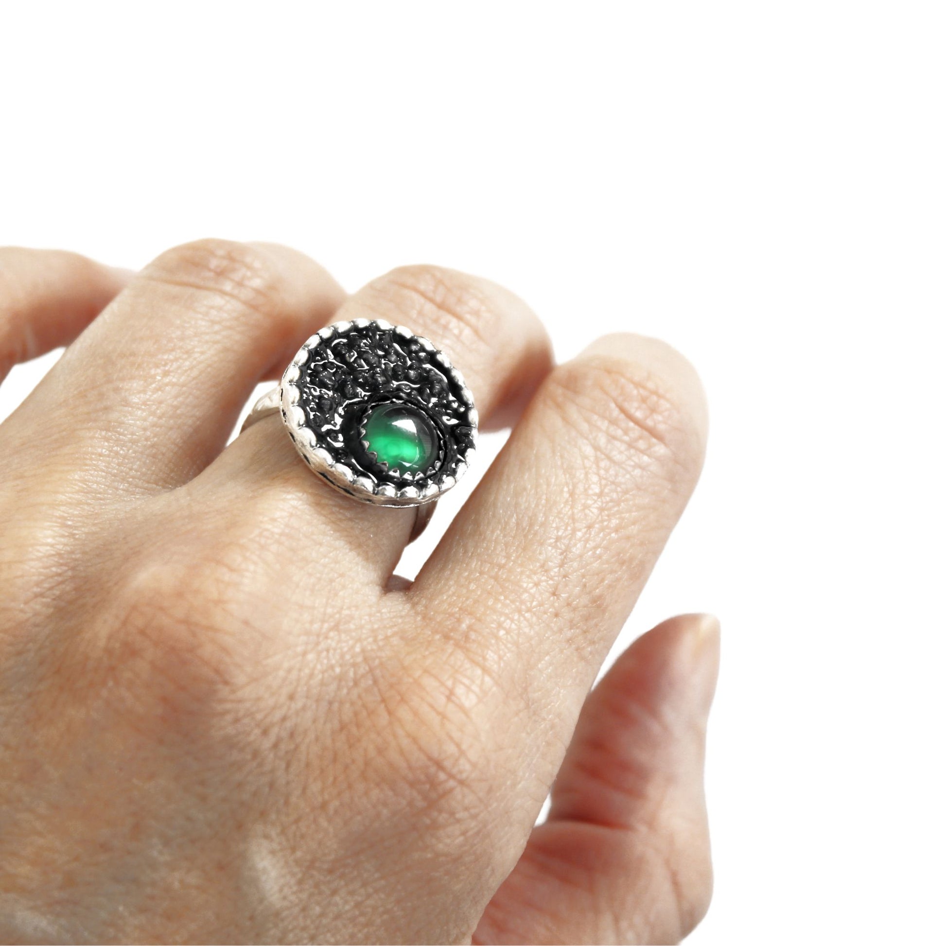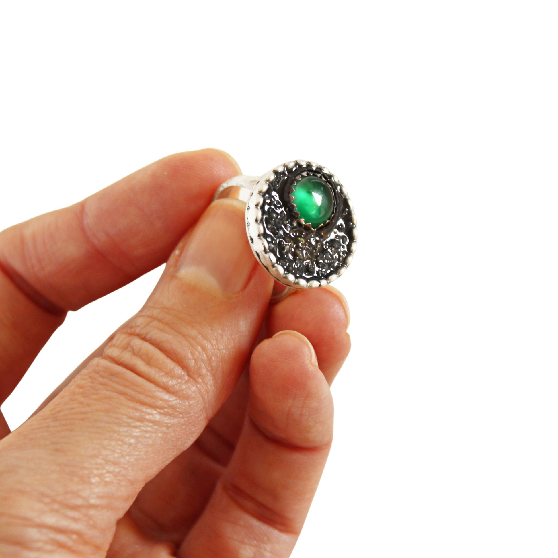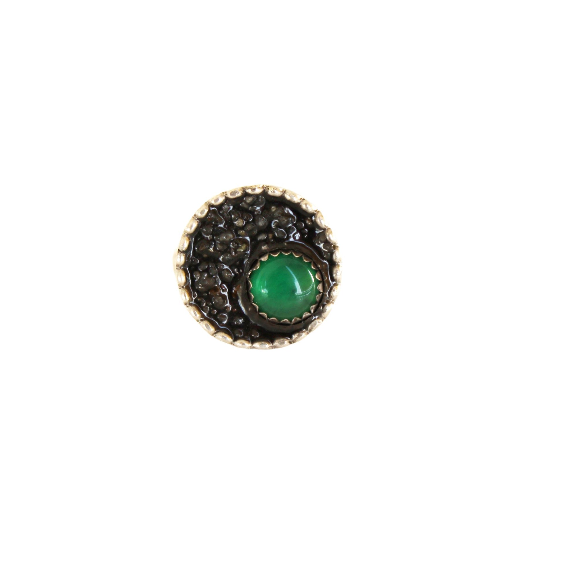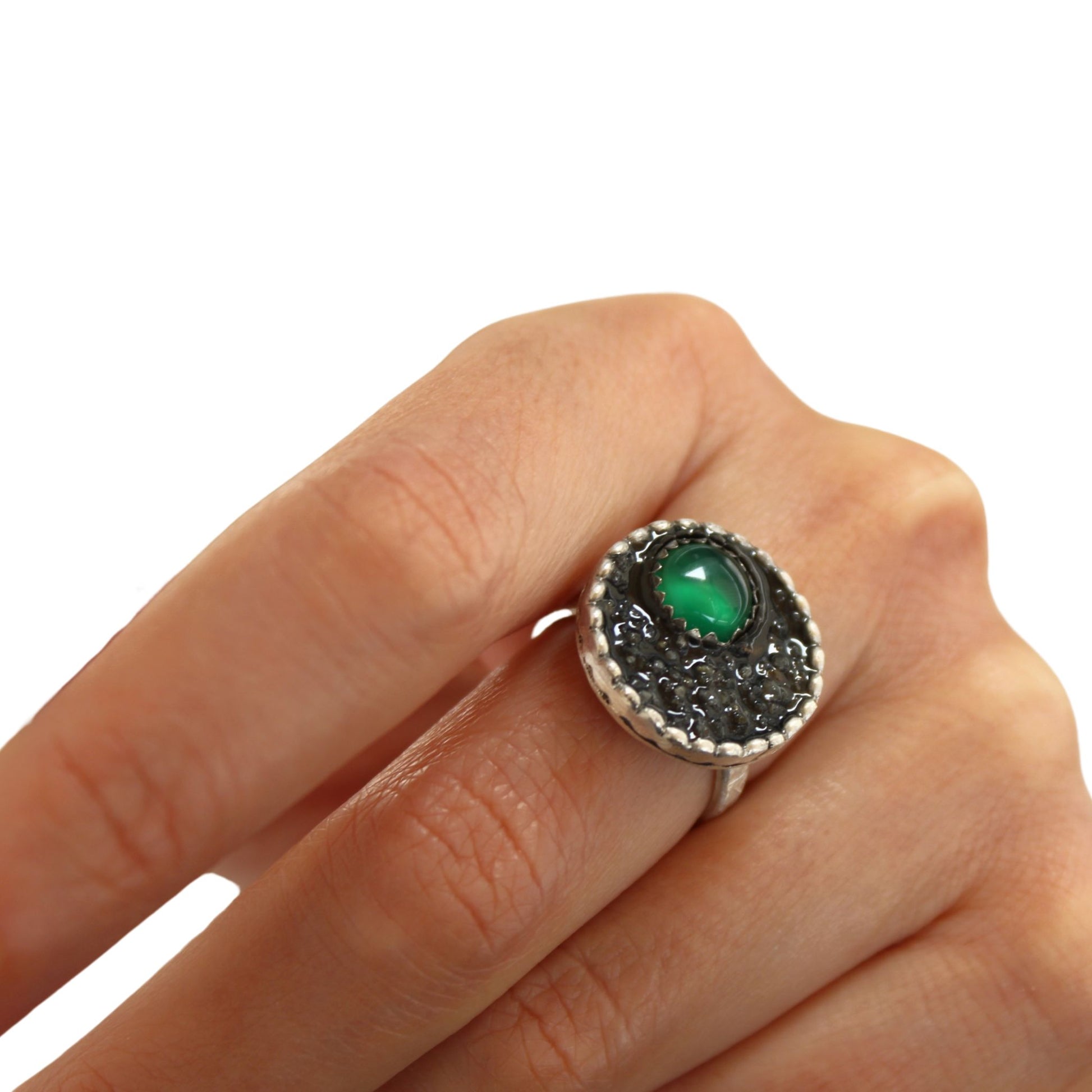 Αυτό το χειροποίητο δαχτυλίδι αιχμαλωτίζει την ουσία της ακτής, συνδυάζοντας οργανική υφή από τη χρήση της άμμου με ένα ζωηρό πράσινο αχάτη. Η ανάγλυφη επιφάνεια που θυμίζει βρεγμένη άμμο, αγκαλιάζει την πέτρα σαν θησαυρό μιας παλίρροιας. Ένα μοναδικό κόσμημα που αποπνέει τη γαλήνια δύναμη της φύσης — τολμηρό, γειωμένο και ήρεμο.